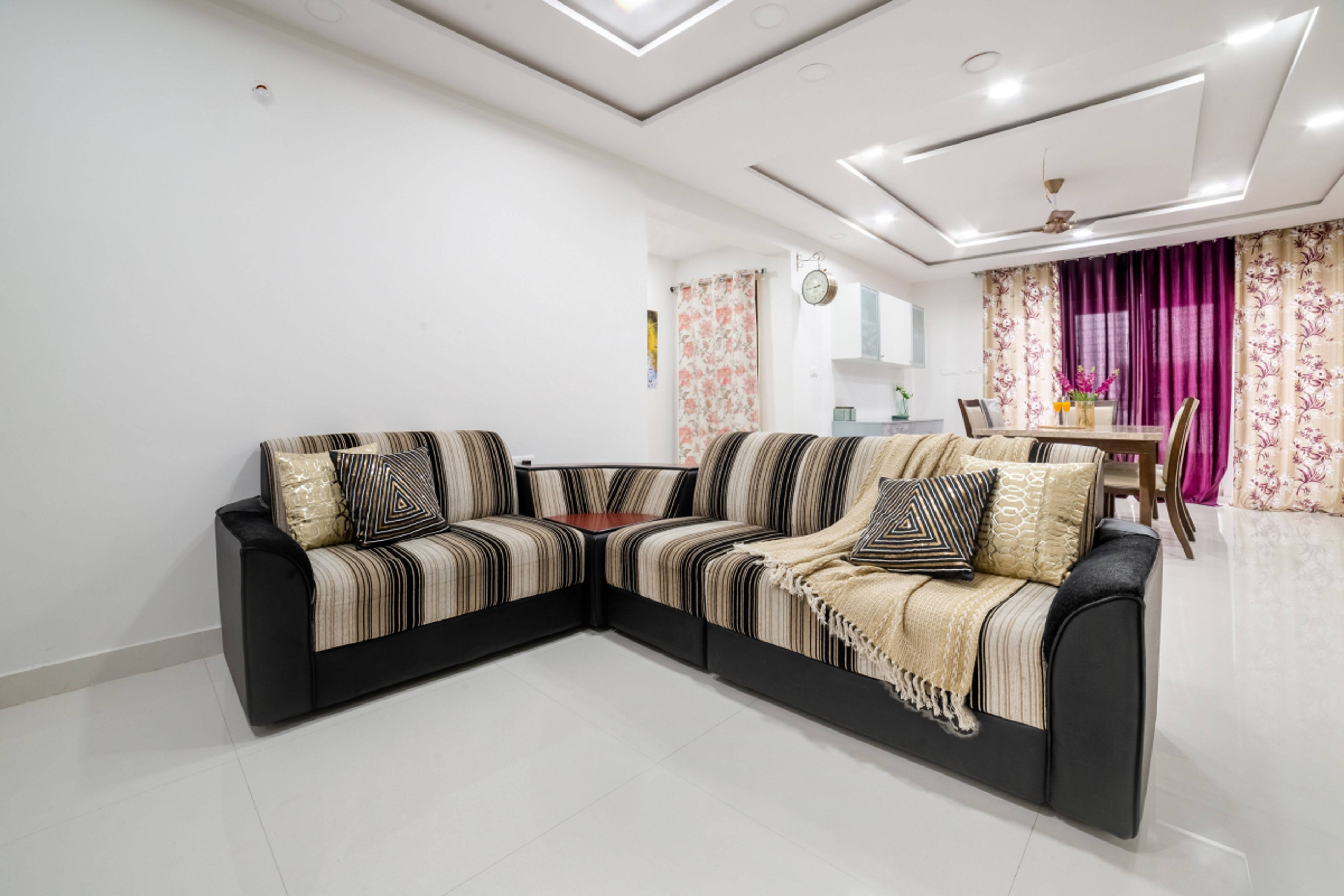 • Furniture Highlights: L-shaped sofa with printed fabric
