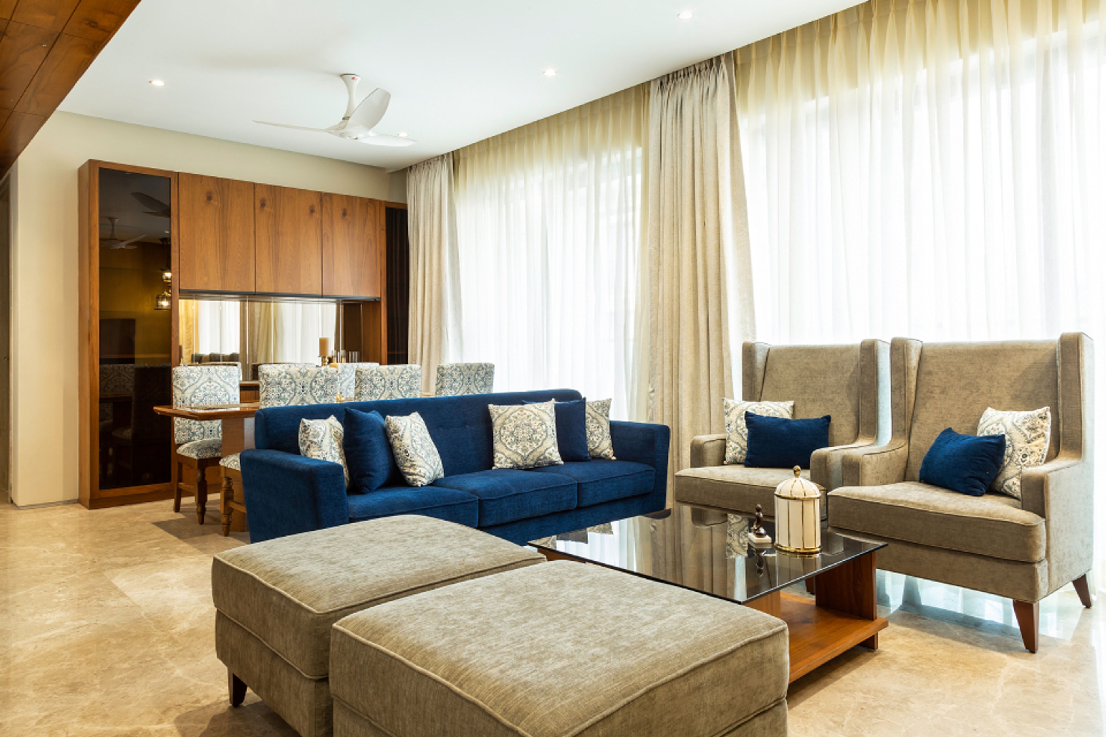 • Room Highlights: Contrasting shades of blue and brown lend an eclectic touch to the living room design