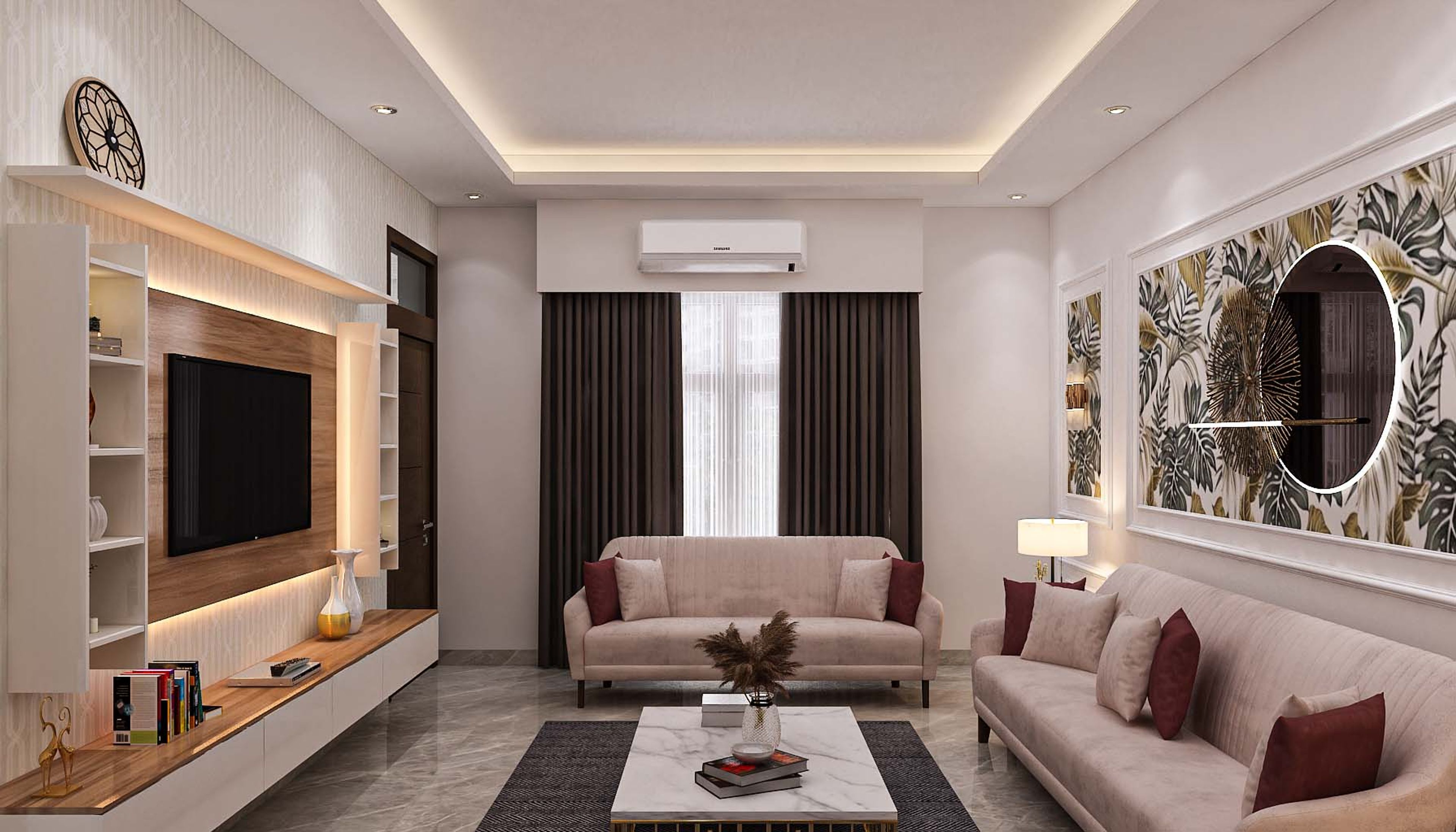 Do up your home with this living room design that follows a contemporary theme with wall trims and a tropical wallpaper. The room is spacious with a sofa set and arm chairs. This room is well lit with a false ceiling and cove lighting.