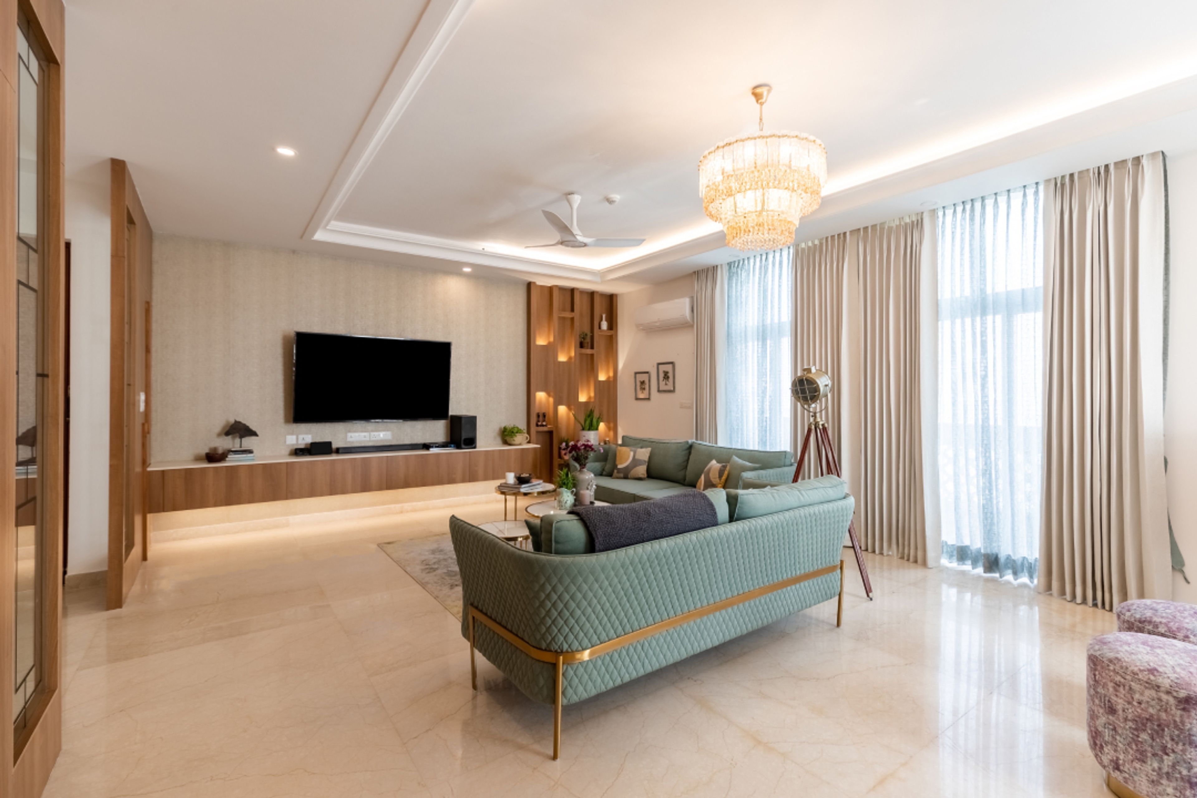 Popular materials include engineered wood or veneer for TV units, marble or vitrified tiles for flooring, and high-gloss laminates or PU paints for cabinets. Textured paints, wallpapers, or wall panels add depth and richness.