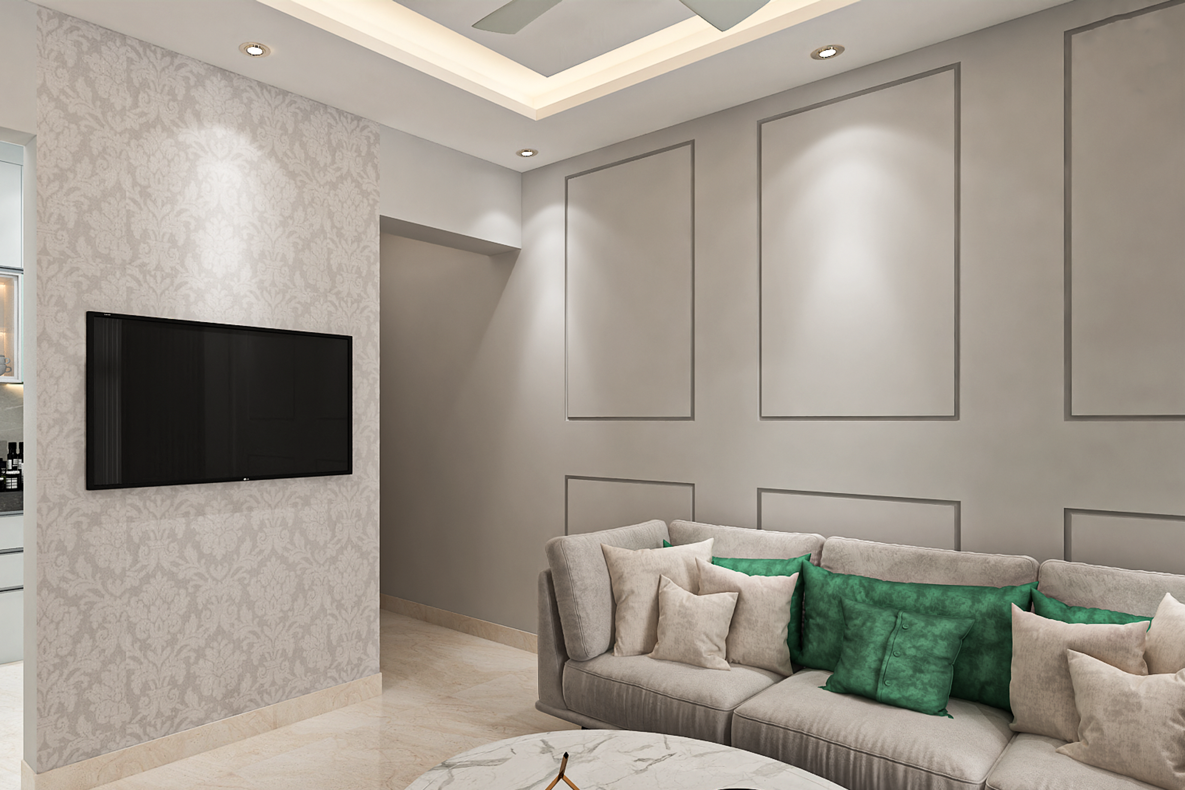 A neutral colour palette is used in this living room design. To add to the contemporary theme, the design includes refreshing colours like green and brown. The spacious design is comfortable and perfect for a family. It includes a sofa set and accent chairs.