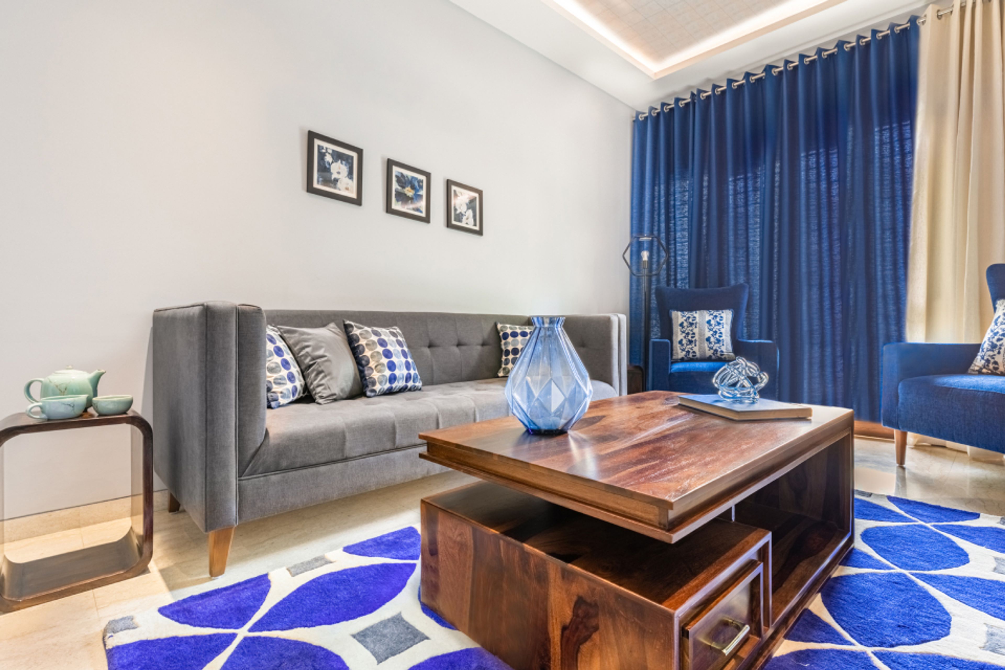Livspace offers up to 10 years of warranty on Modern Drawing Room Design With Blue And Grey Seating, covering material quality, hardware, and installation workmanship. Warranty terms may vary based on chosen finishes and components.