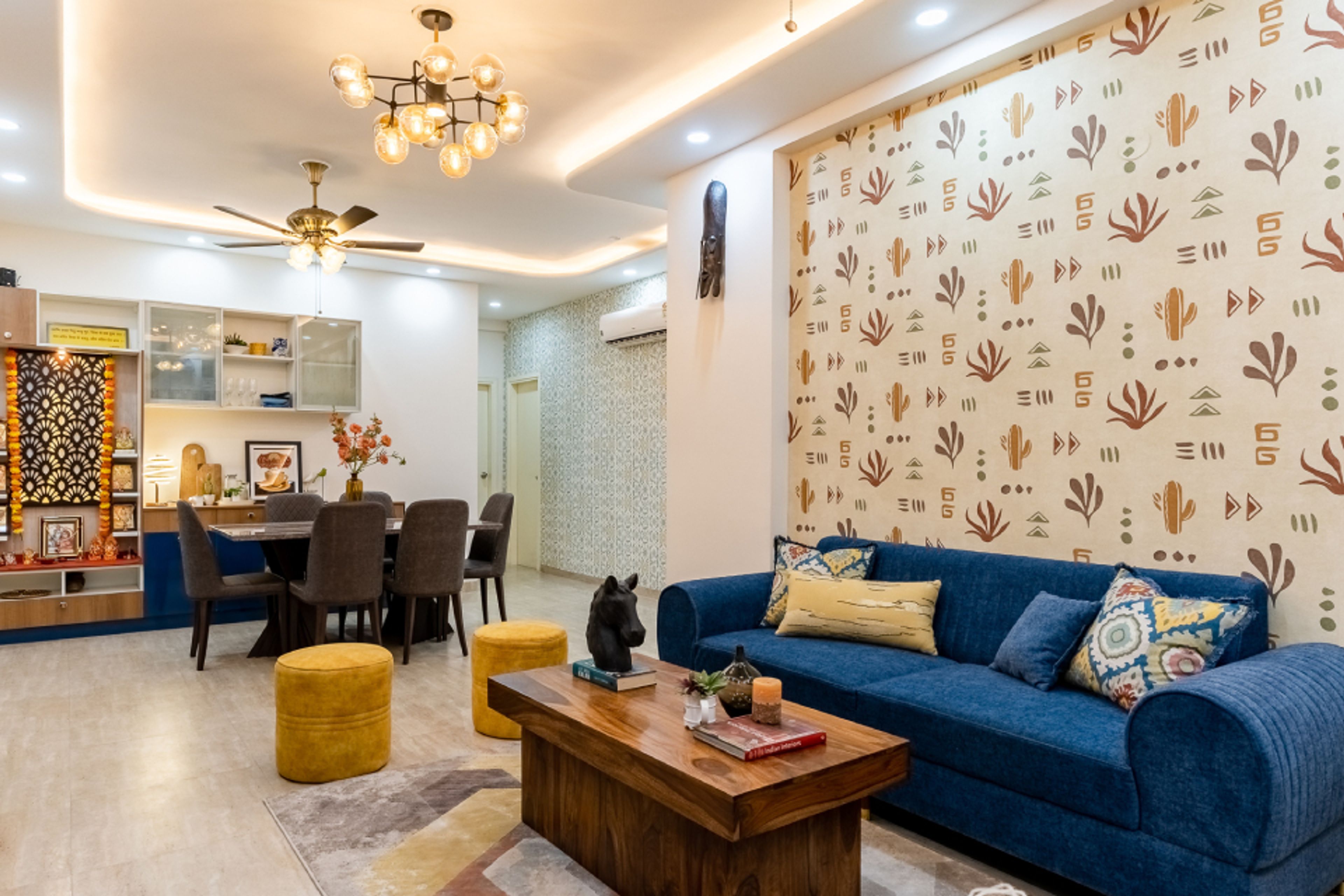 2. Blue and yellow furniture adds contrast to the drawing room design