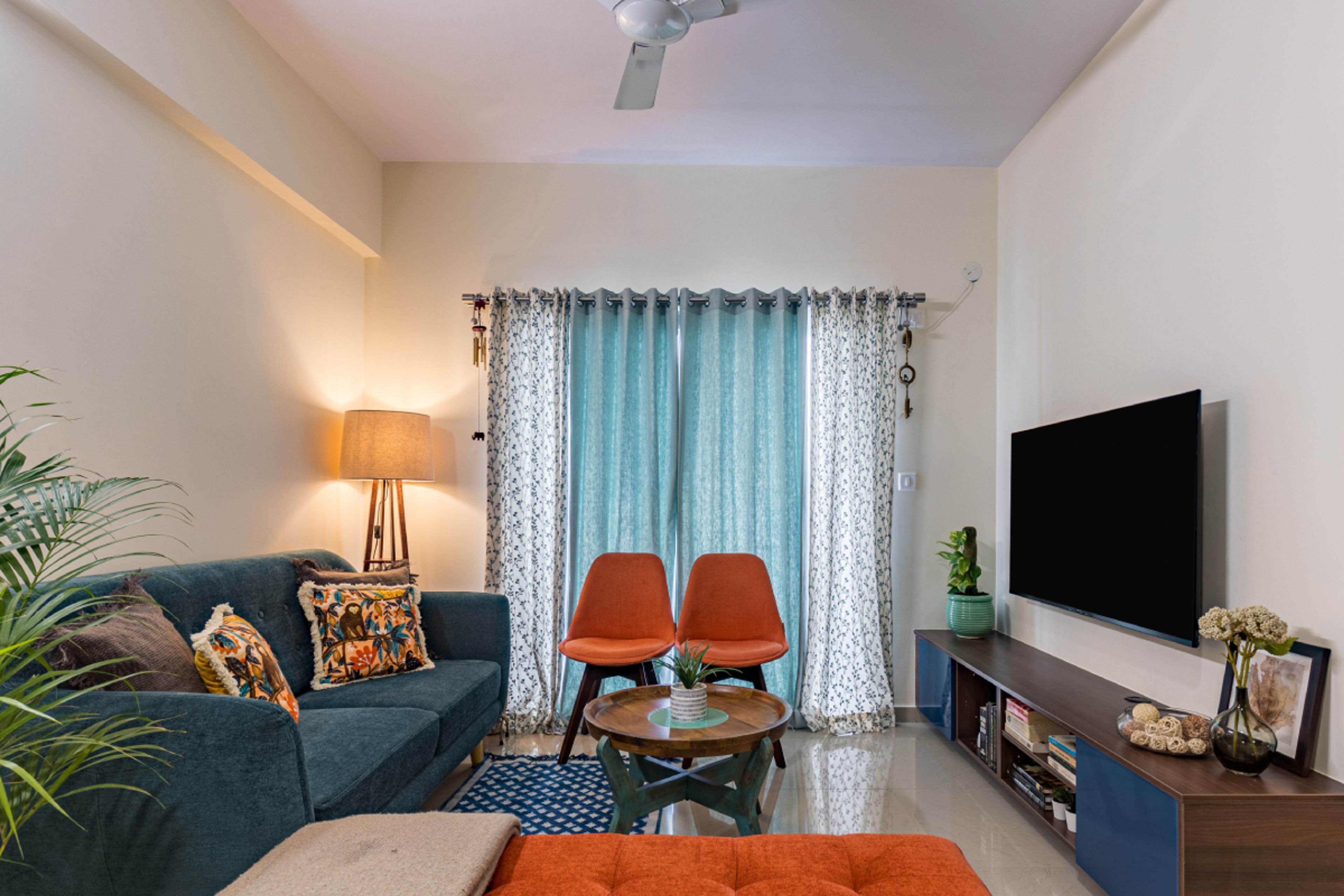 Livspace offers up to 10 years of warranty on Modern Living Room Design With A 2-Seater Blue Sofa And 2 Orange Chairs, covering material quality, hardware, and installation workmanship. Warranty terms may vary based on chosen finishes and components.