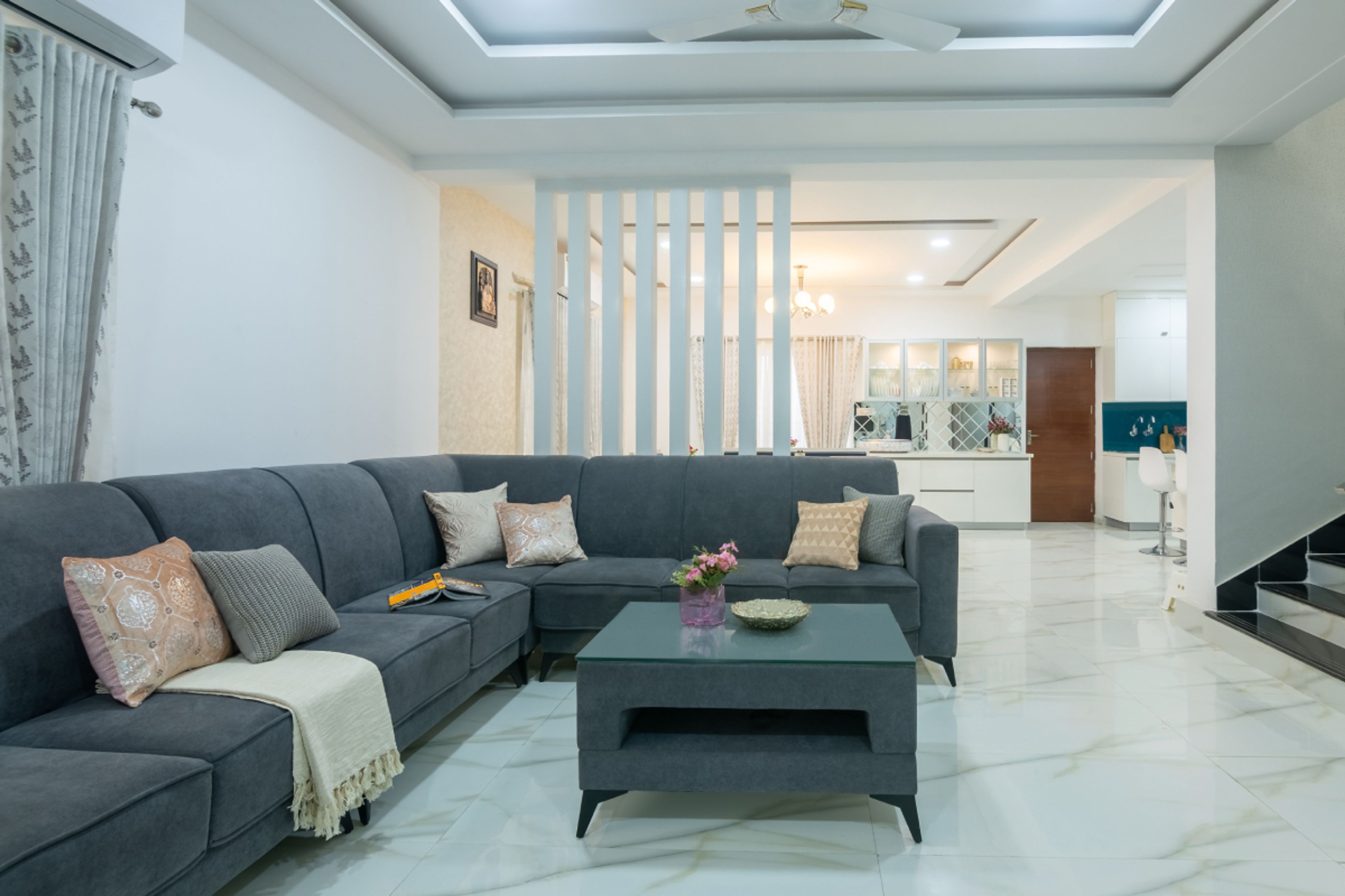Livspace offers up to 10 years of warranty on Modern Living Room Design With An L-Shaped Grey Upholstered Sofa, covering material quality, hardware, and installation workmanship. Warranty terms may vary based on chosen finishes and components.