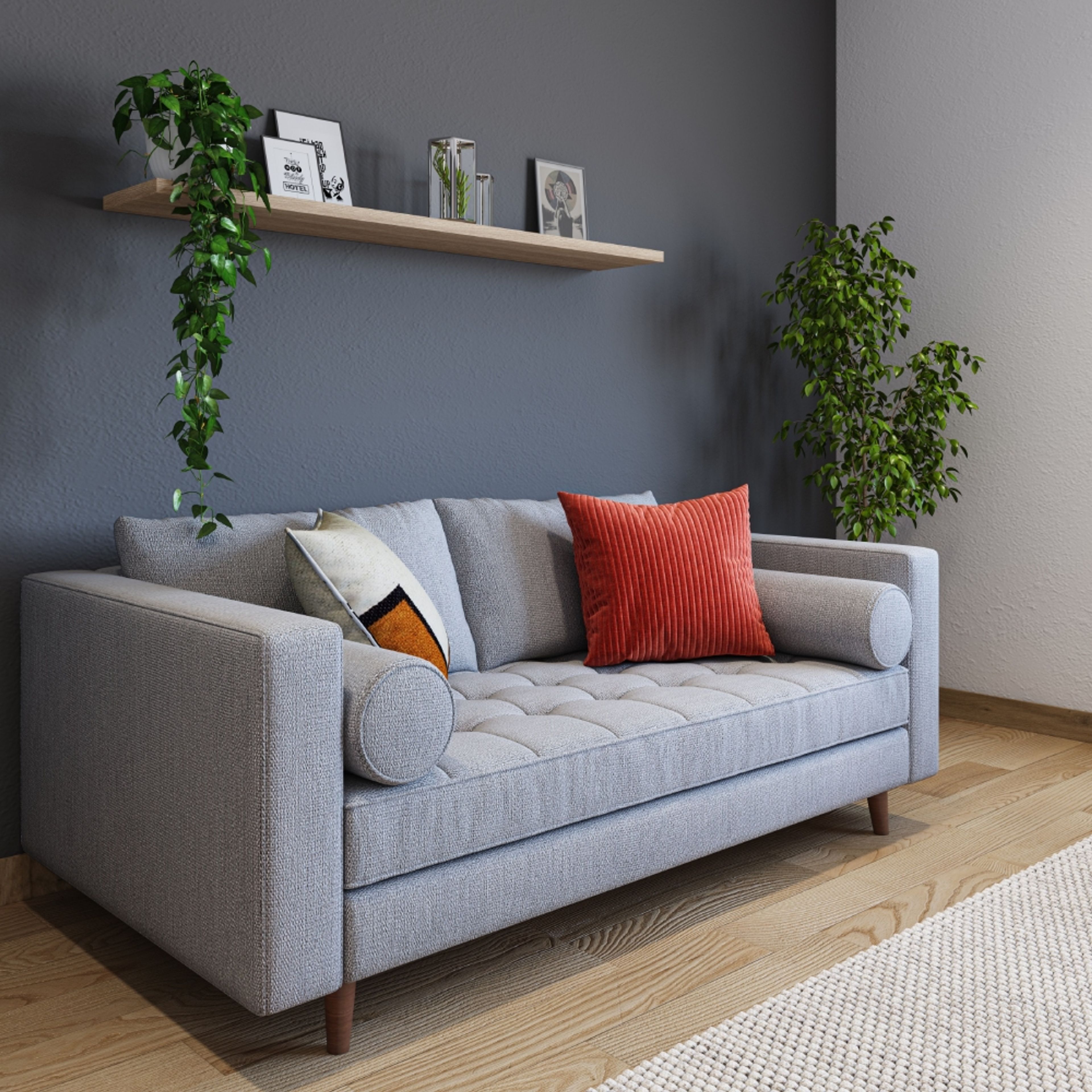 Storage Features: A single wall-mounted shelf is highlighted by the dark grey accent wall and is the perfect place to display your living room curios