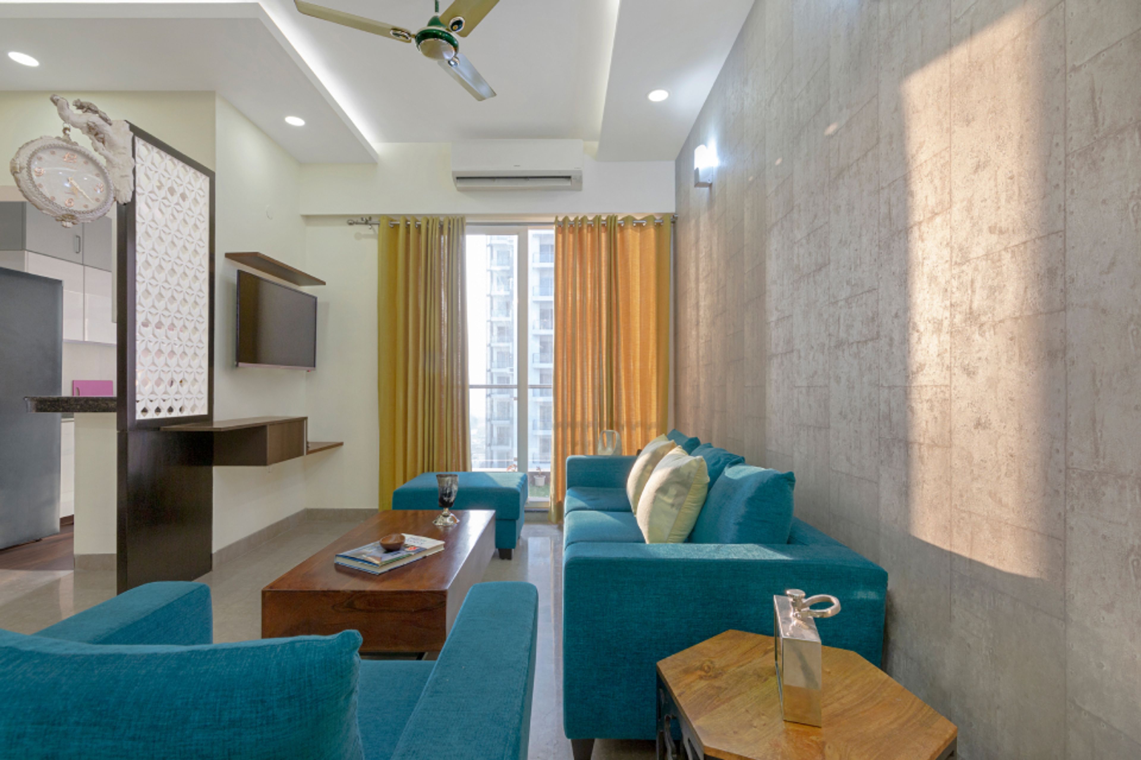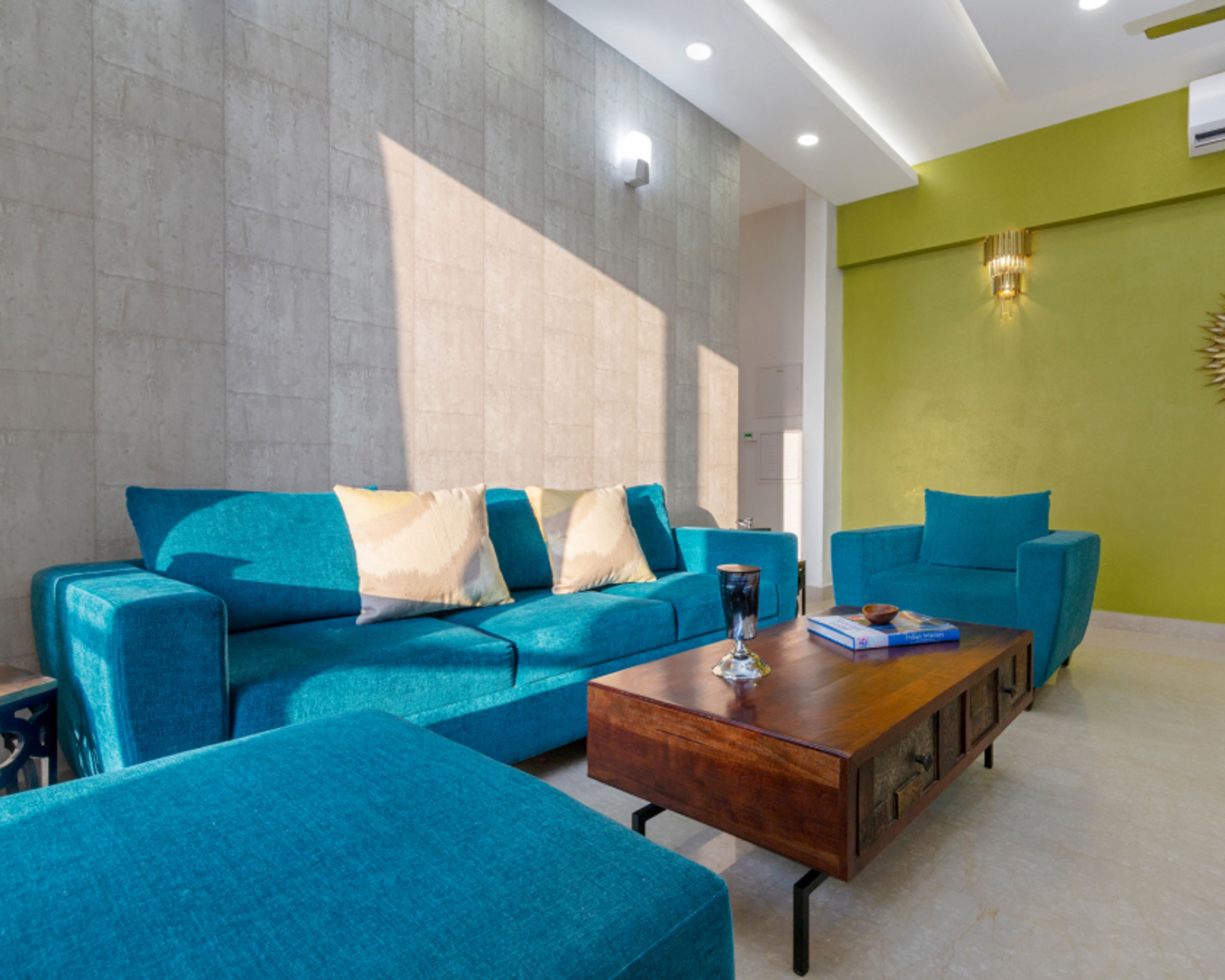 Livspace offers up to 10 years of warranty on Modern Living Room Design With Spacious Blue Sofa, covering material quality, hardware, and installation workmanship. Warranty terms may vary based on chosen finishes and components.