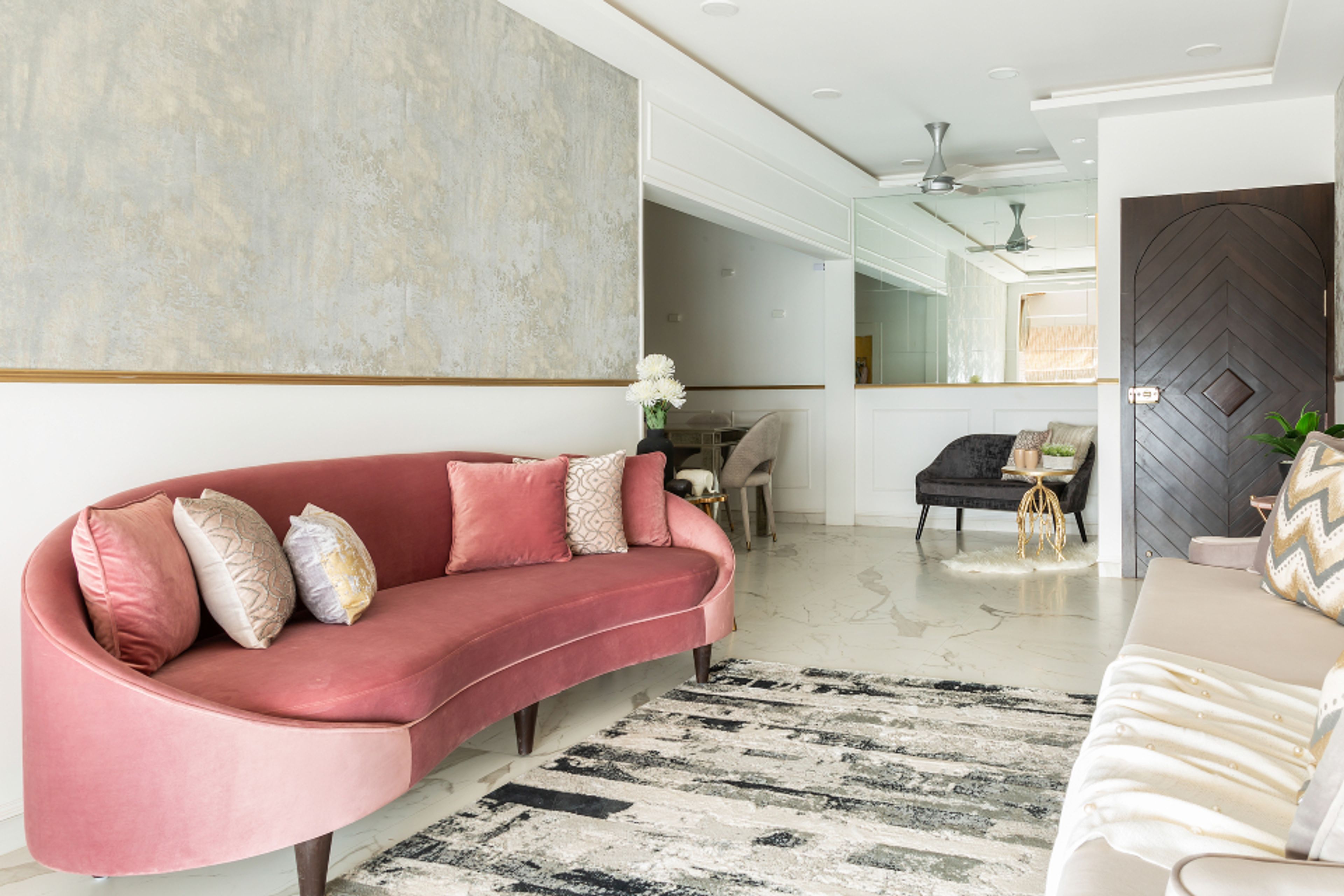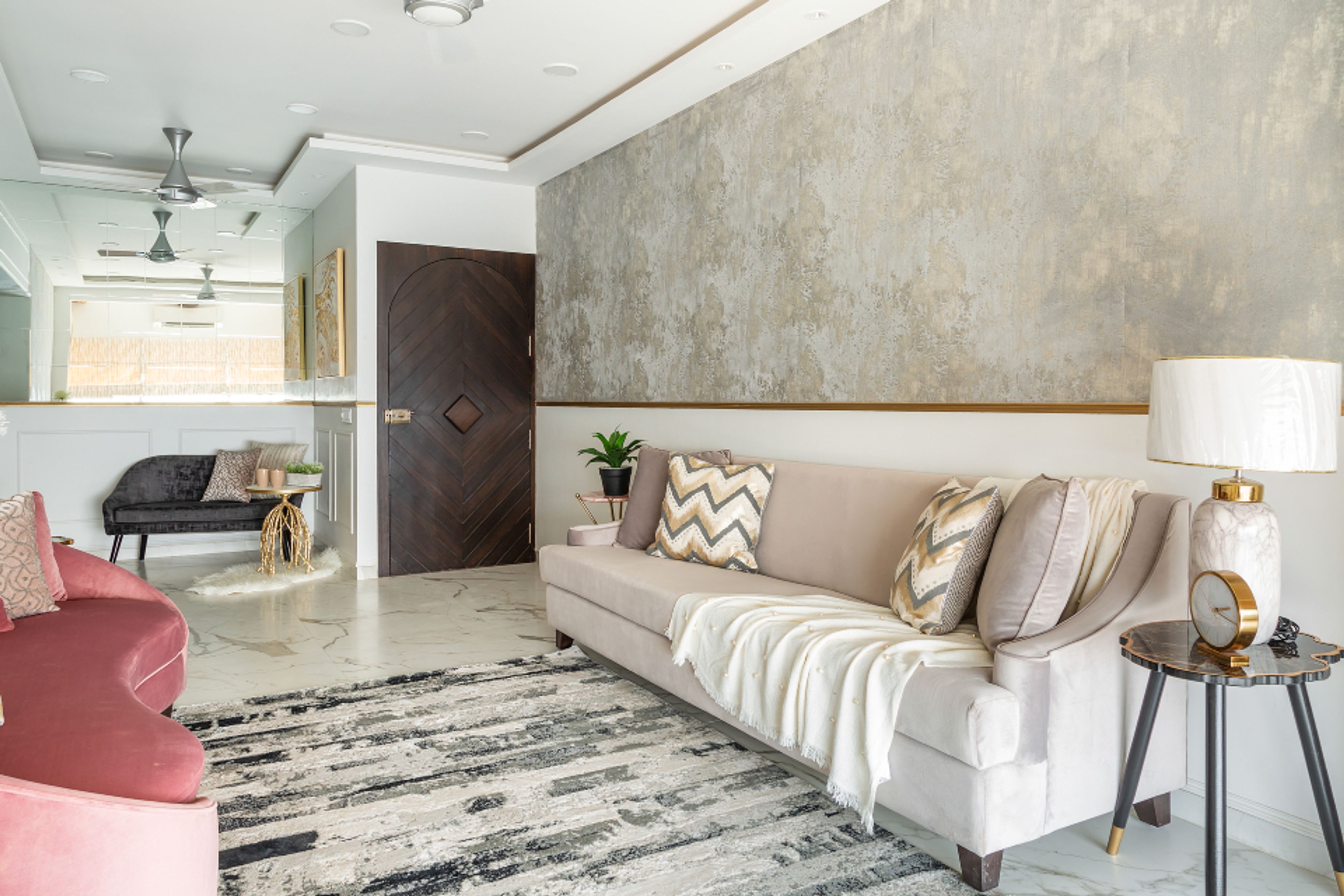 • Room Highlights: Neutral-toned wallpaper adds depth to the living room design