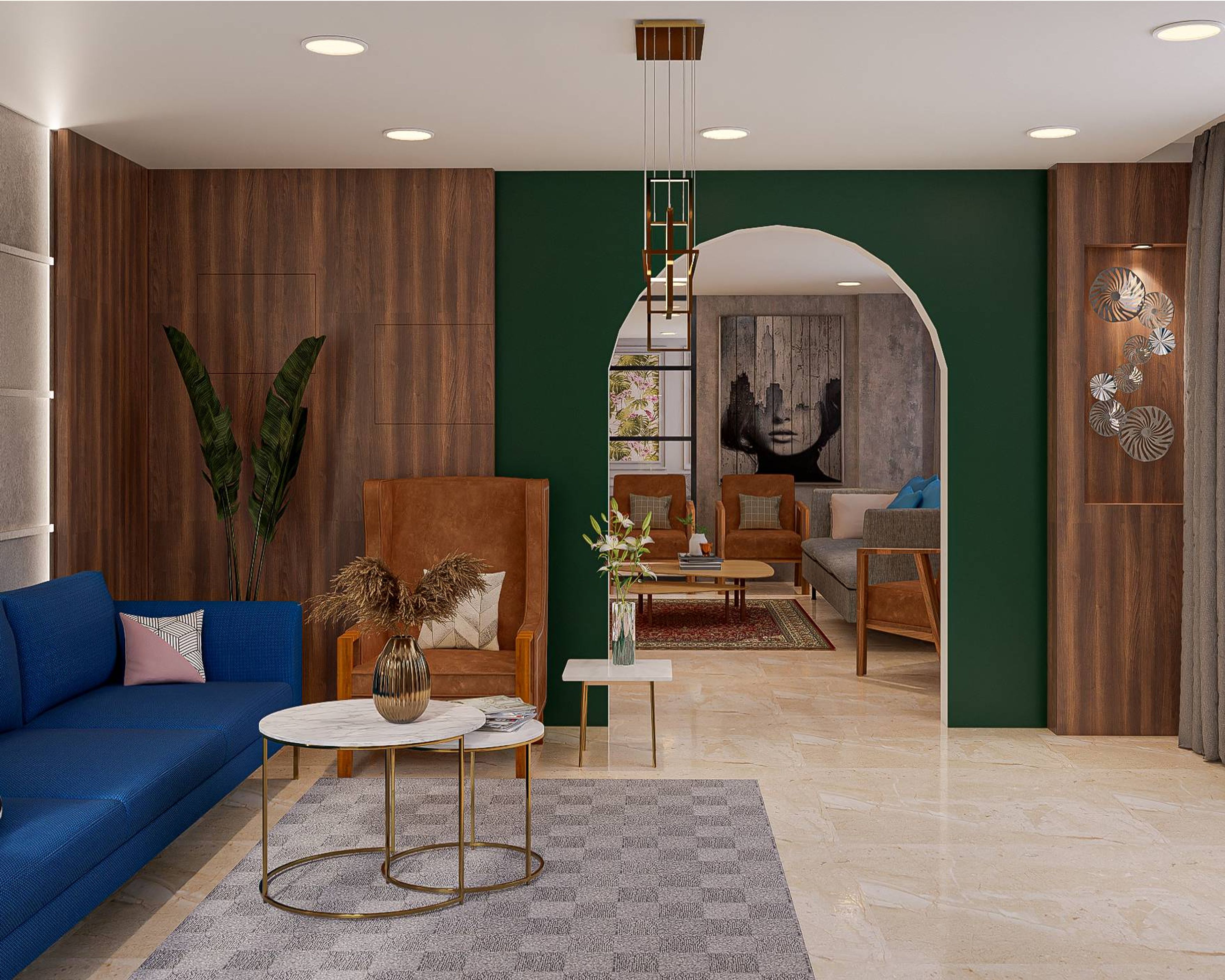 This design portrays a good composition of natural wood finishes and concrete panels on the walls, creating a cosy yet modern vibe in your living space. The warm light from the brass detailed wall lamp and the ceiling light installation illuminate the space well. Grey curtains and a rug work in harmony with the square concrete panels on the wall. There is a bold touch of blue used on the upholstery of the sofa in this living room design.