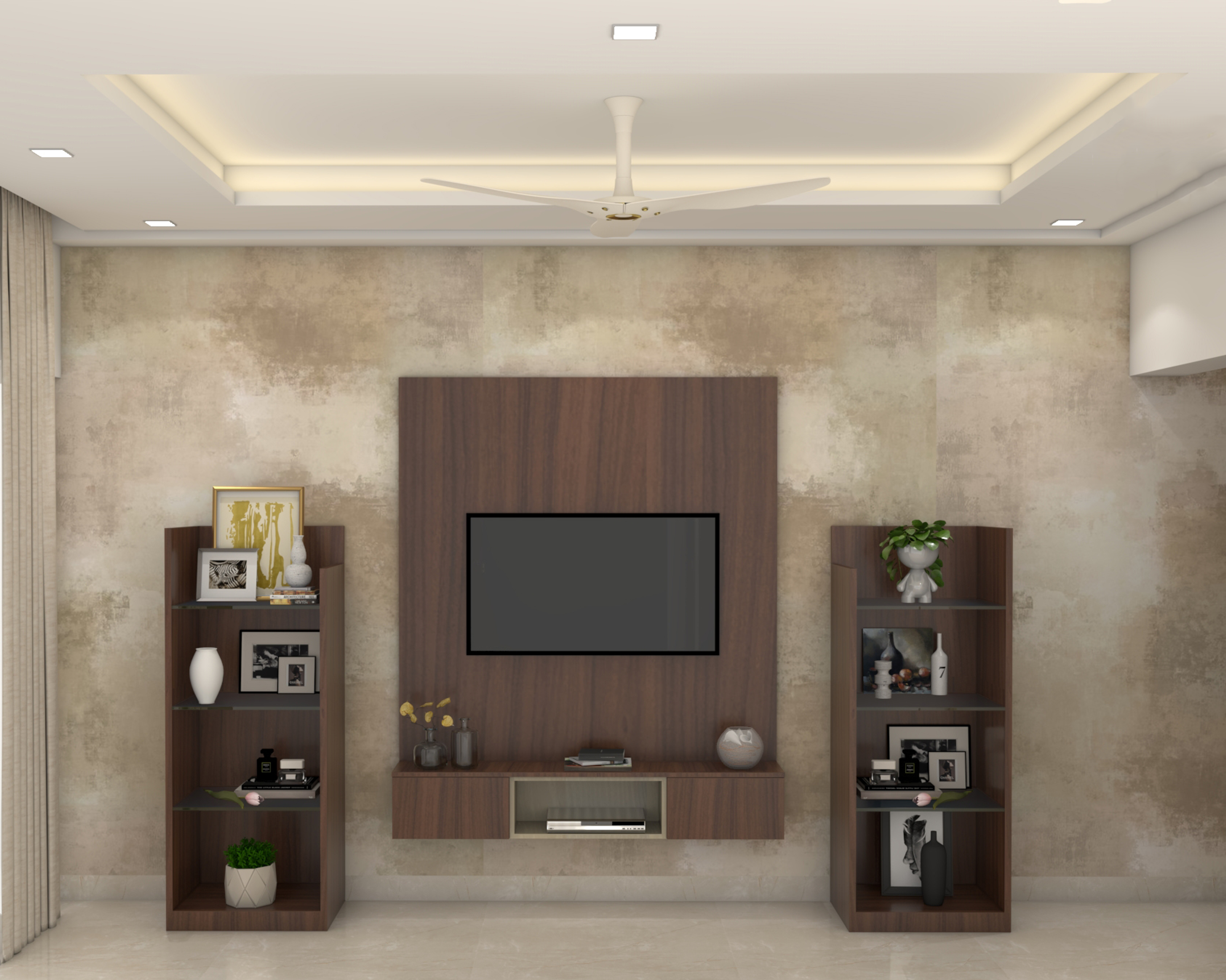 This compact living room is perfect for five people with the white upholstered sofa set. The ambient lighting with recessed and cove lighting enhances the modern decor. The TV wall cabinet in wood looks fresh and blends with a beige texture and also has space to store.