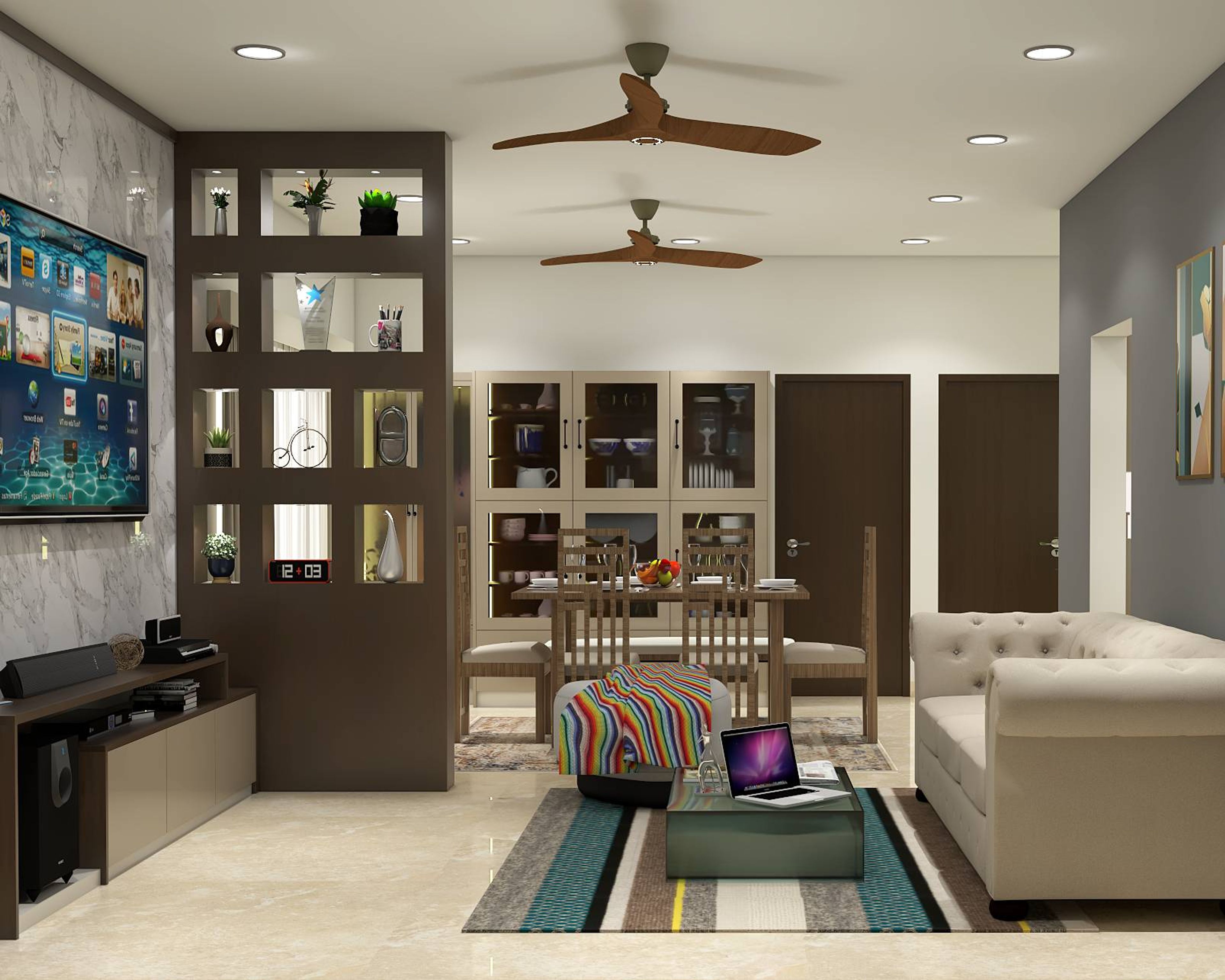 This spacious living room is styled with modern interiors. The off-white tufted sofa is paired with a rectangular glass coffee table for s sleek look. The white marble TV backsplash with beige and brown console table looks lovely. The multicolour rug suits the overall interiors.