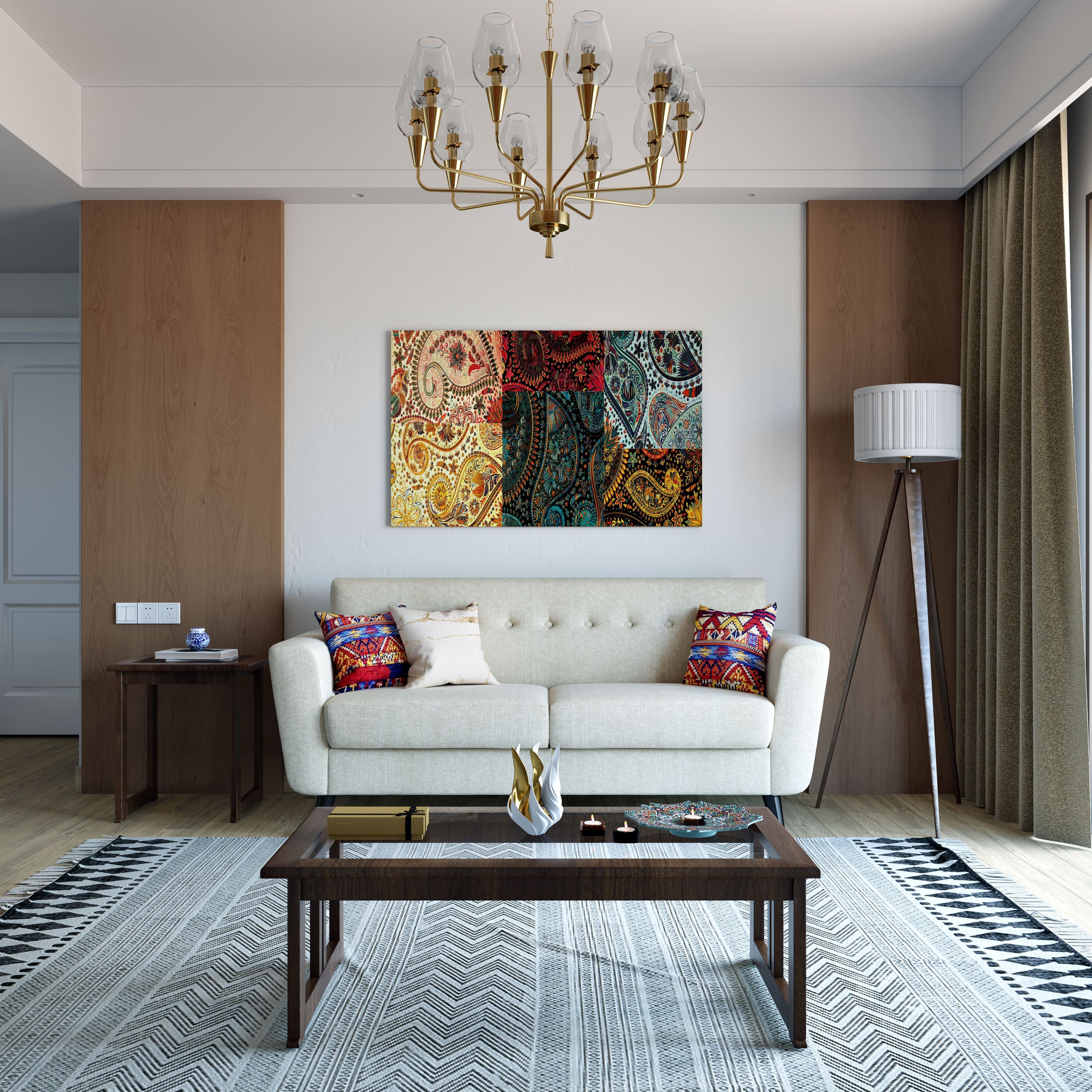 With a 2-seater sofa that has a clean quilted tuft look covered with premium quality fabric, this warm, Scandinavian-themed living room design has sunlight coming in through the full-length windows that look beautiful with airy white curtains. The green plants in the corner bring a ting of jazz to the living space, while the sleek black coffee table adds a touch of sophistication.