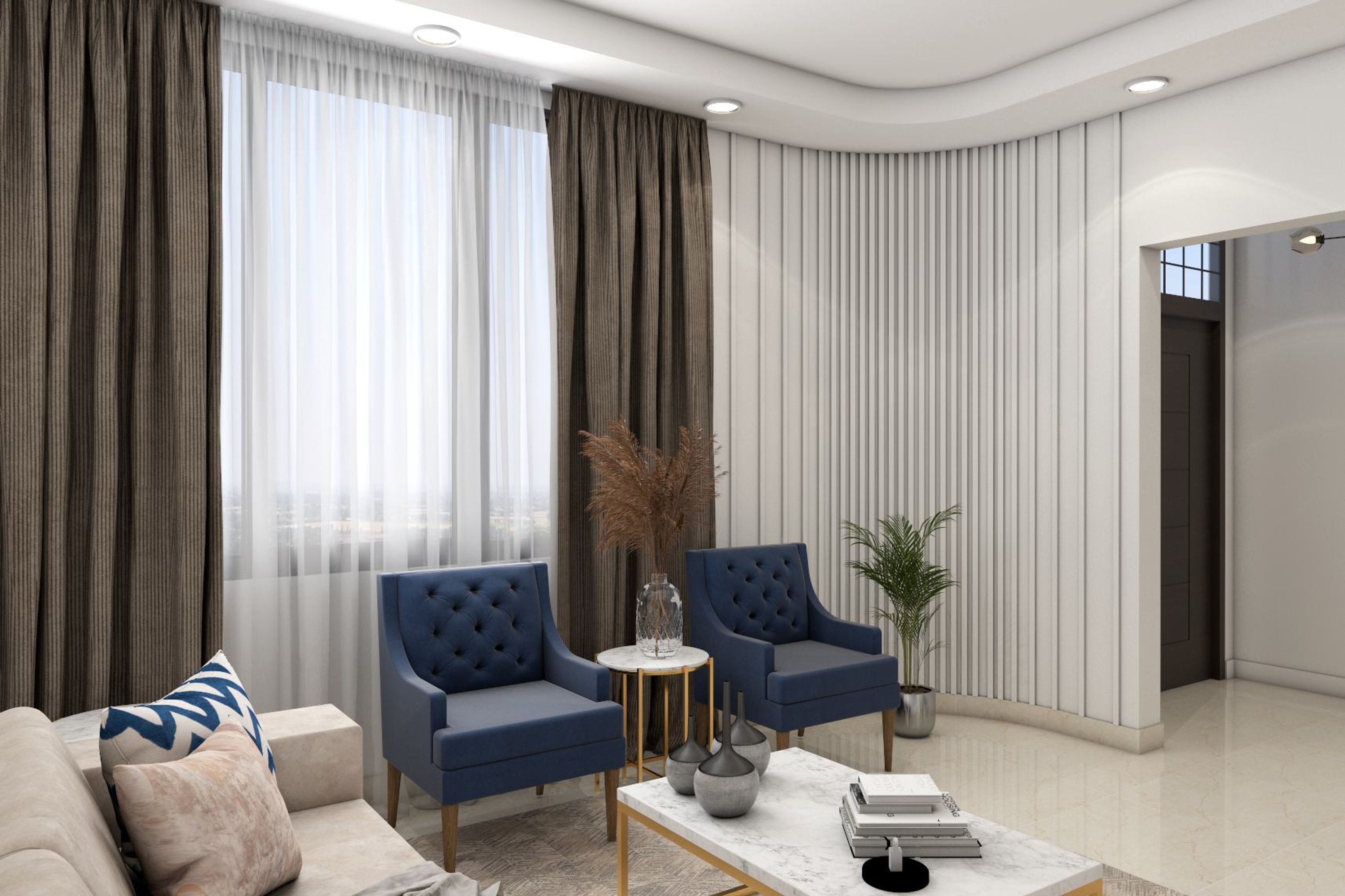 A contemporary-styled living room design for a large family. The walls accentuated in white reapers look subtle and simple, with paintings that stand out boldly. The combination of beige sofas and the blue accent chairs combine well with the marble coffee table to create a relaxing and welcoming atmosphere.