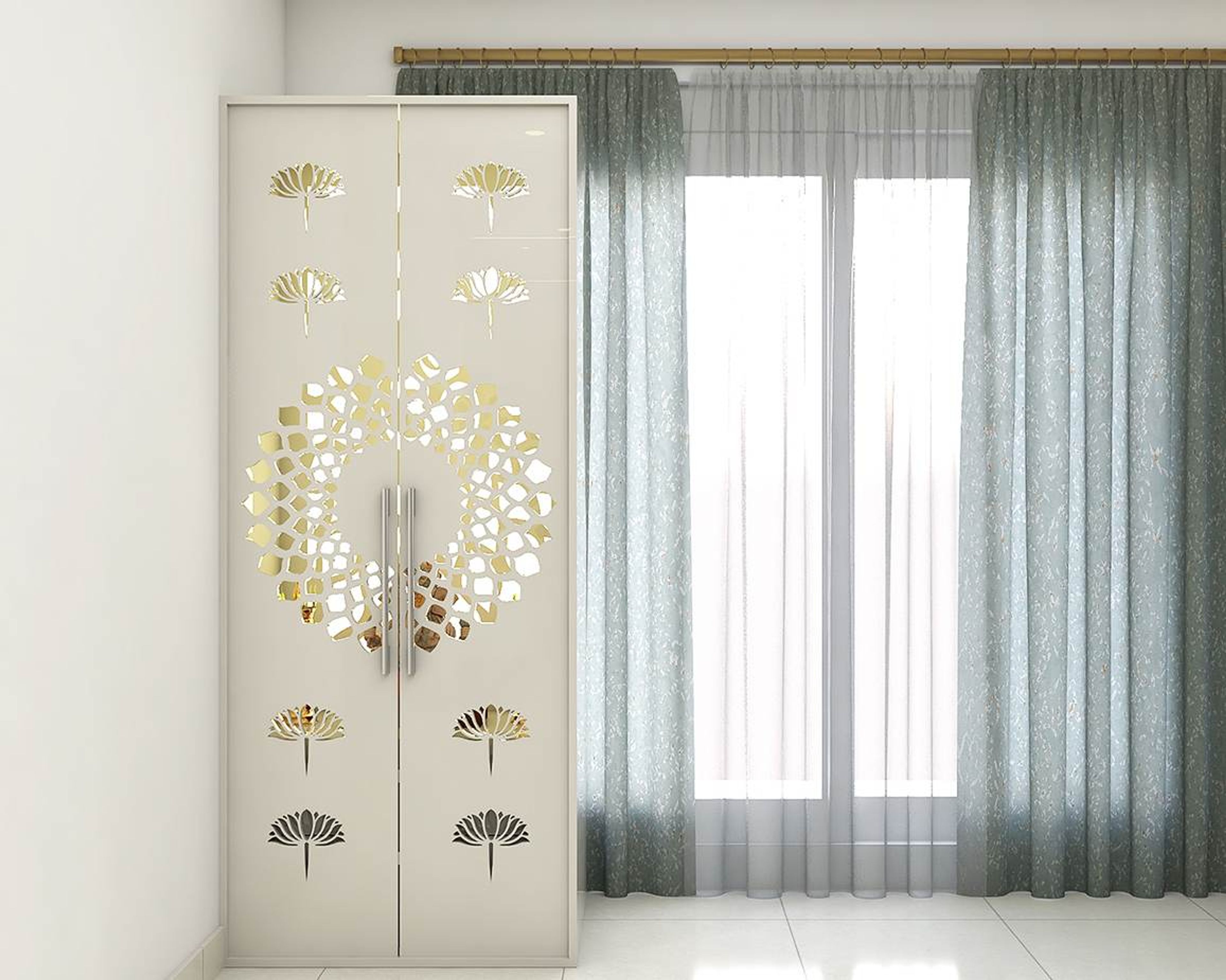 Home/.../Pooja Room/Modern Floor Mounted Mandir Design With Champagne Toned Base Unit