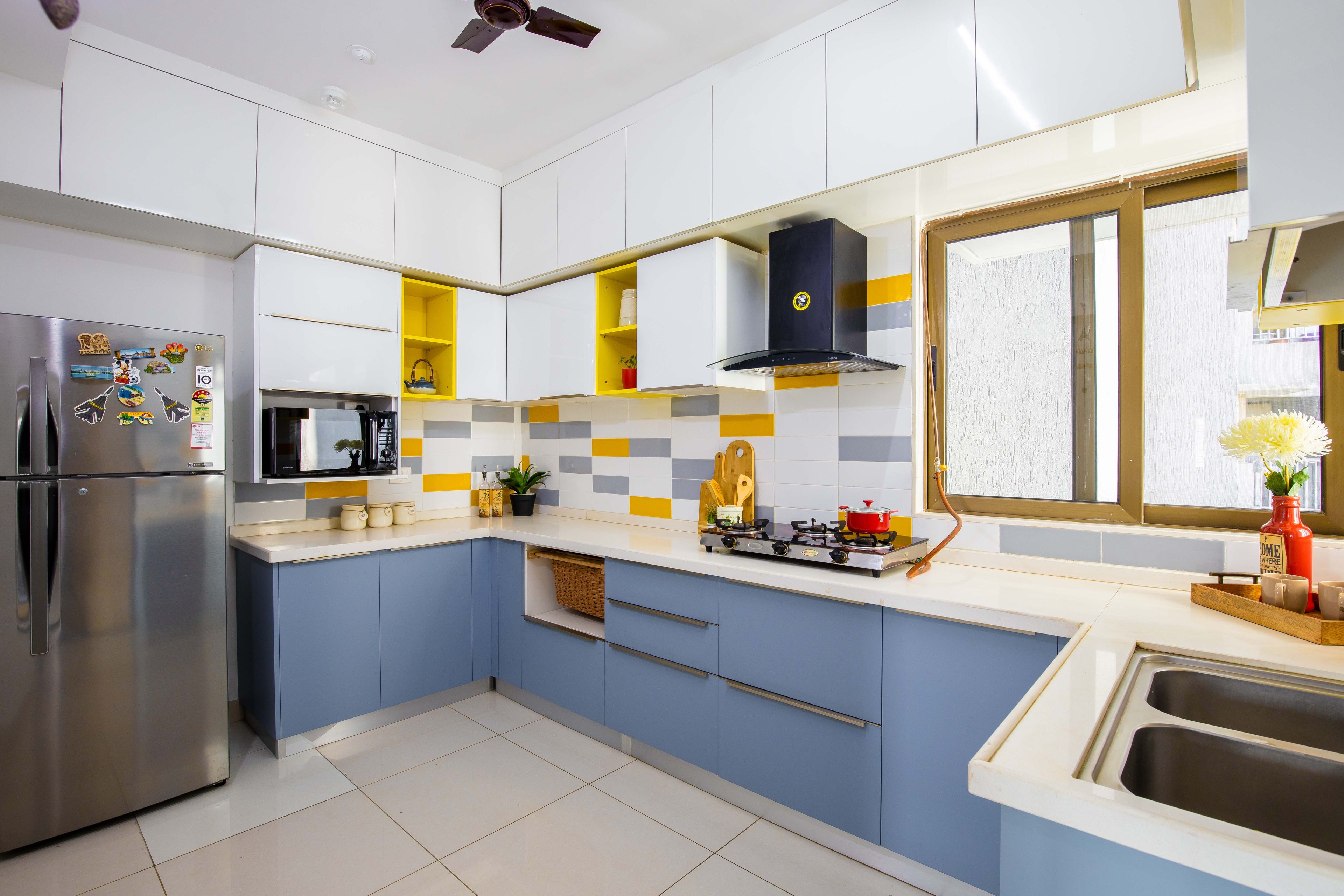This brick-patterned kitchen tile design helps enhance the visual appeal of a modern kitchen layout. While the colourful wall tiles complement the smooth quartz countertop, the vitrified dado merges seamlessly with the wall and base units.