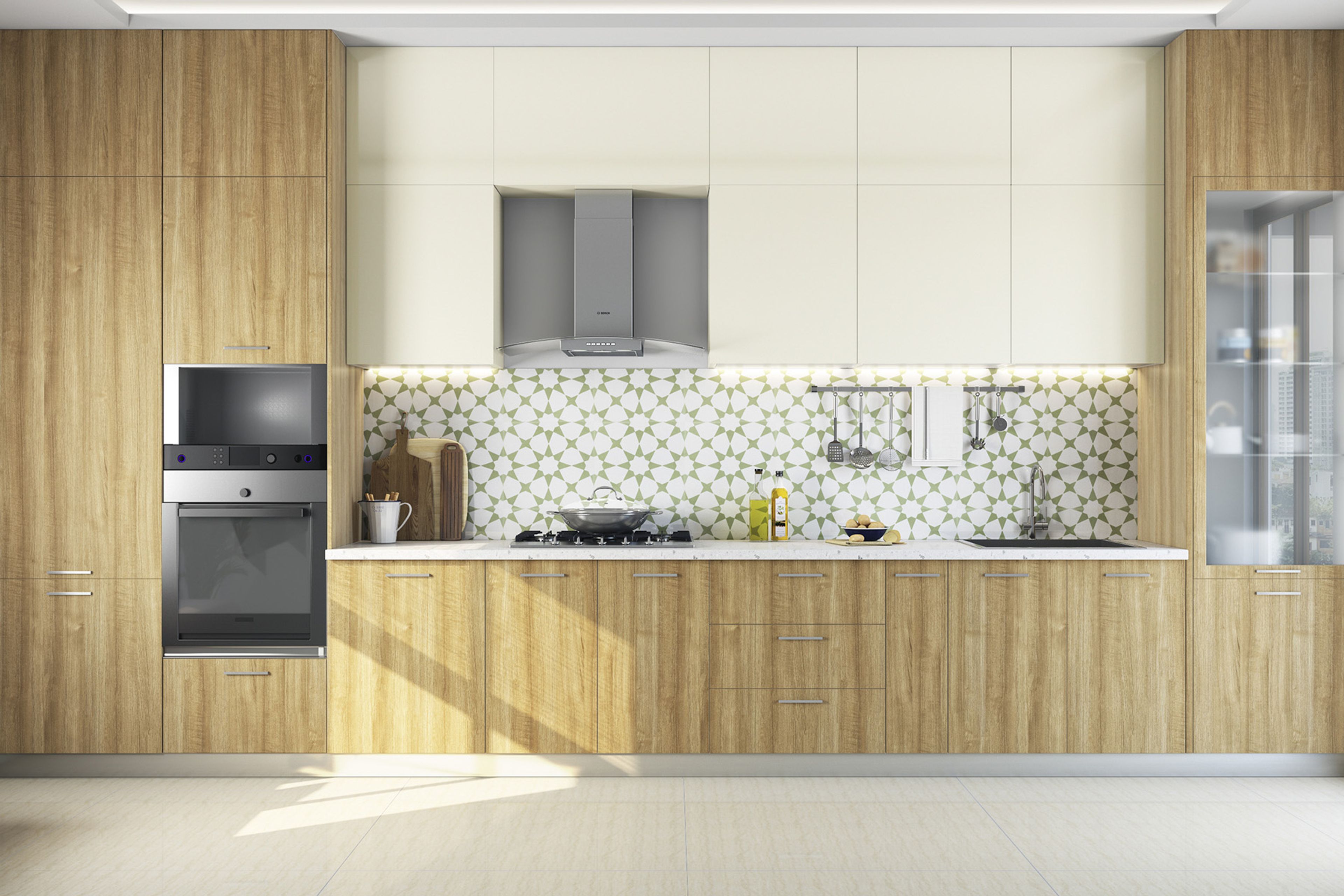 Special Features: The green and white Moroccan-star pattern, adds a visual element to the wooden kitchen design, while offering a refreshing focal point.