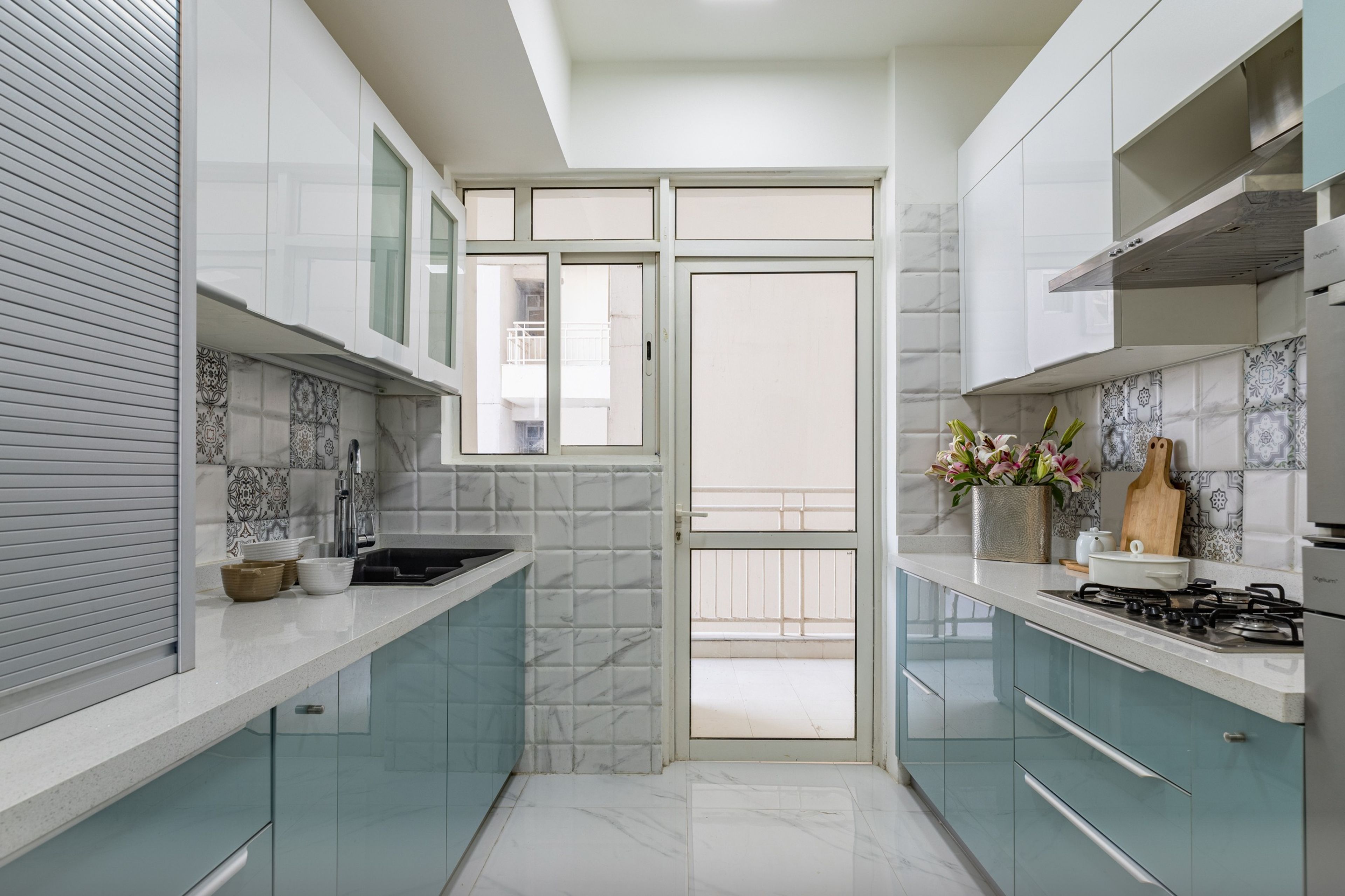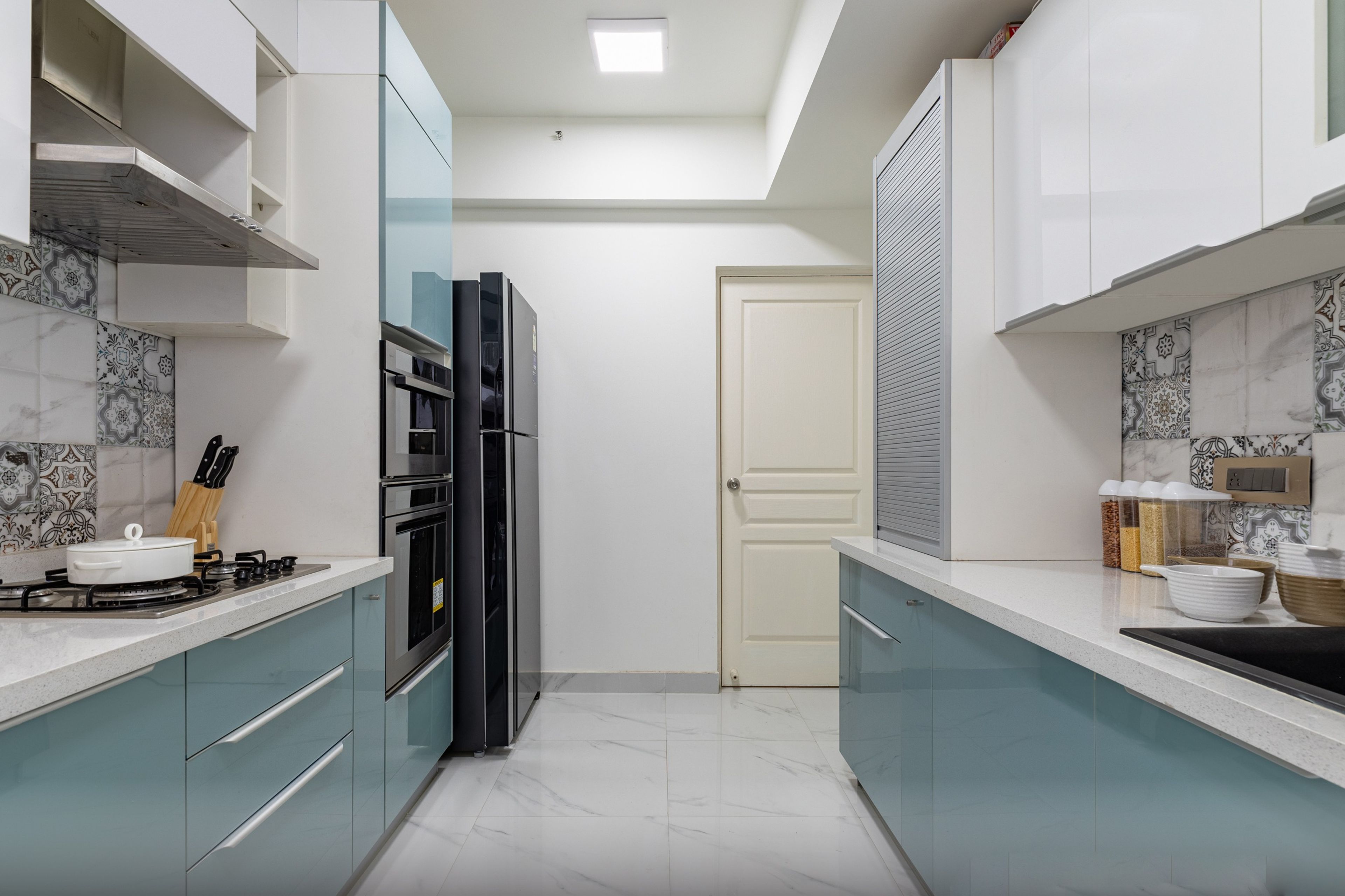 This contemporary kitchen tile design stands out due to the Moroccan patterned backsplash. It complements the white and blue floor tiles, lending the kitchen a clean, cohesive look. The wall and floor tiles are glossy and stain-resistant, which makes them easy to clean.