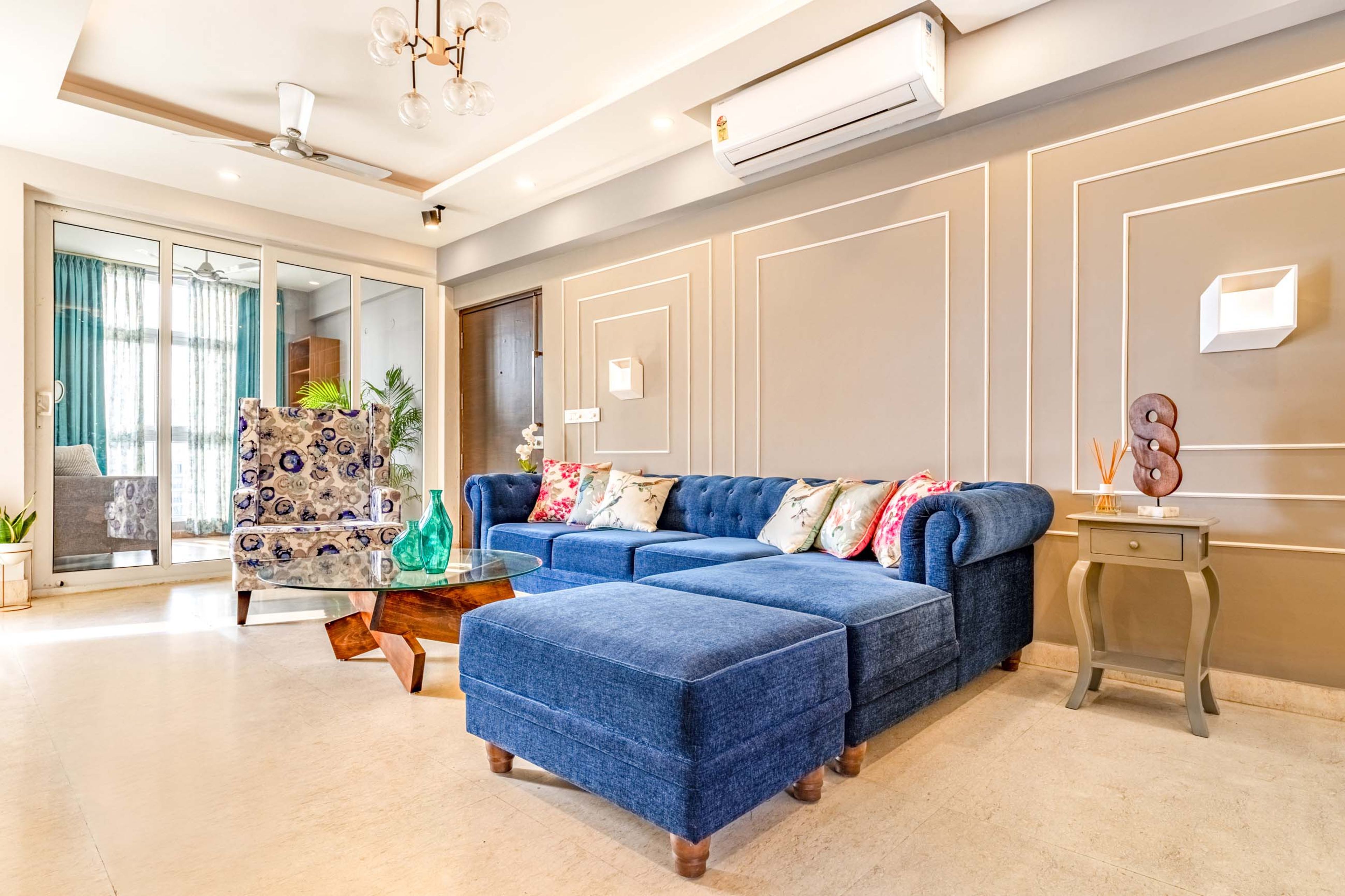The cream-coloured floor tiles wonderfully complement the standout feature of the room - the rich blue sofa. Plus, the matte finish of the tiles merges seamlessly with the room and accentuates its decorative elements.