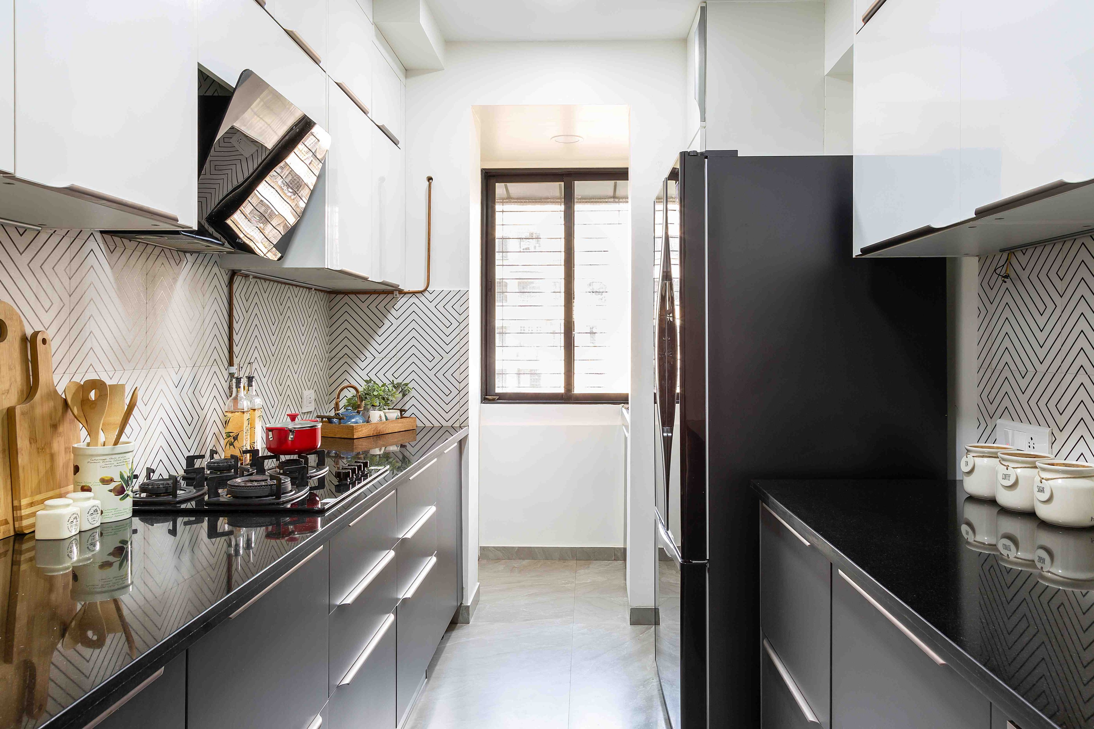 An excellent example of the ‘less is more’ principle, this kitchen tile design comes with a trendy dual-toned pattern that adds a modern touch to the layout. The patterned tiles, couple with the black and white wall cabinets, lend the kitchen a simple yet elegant aesthetic.