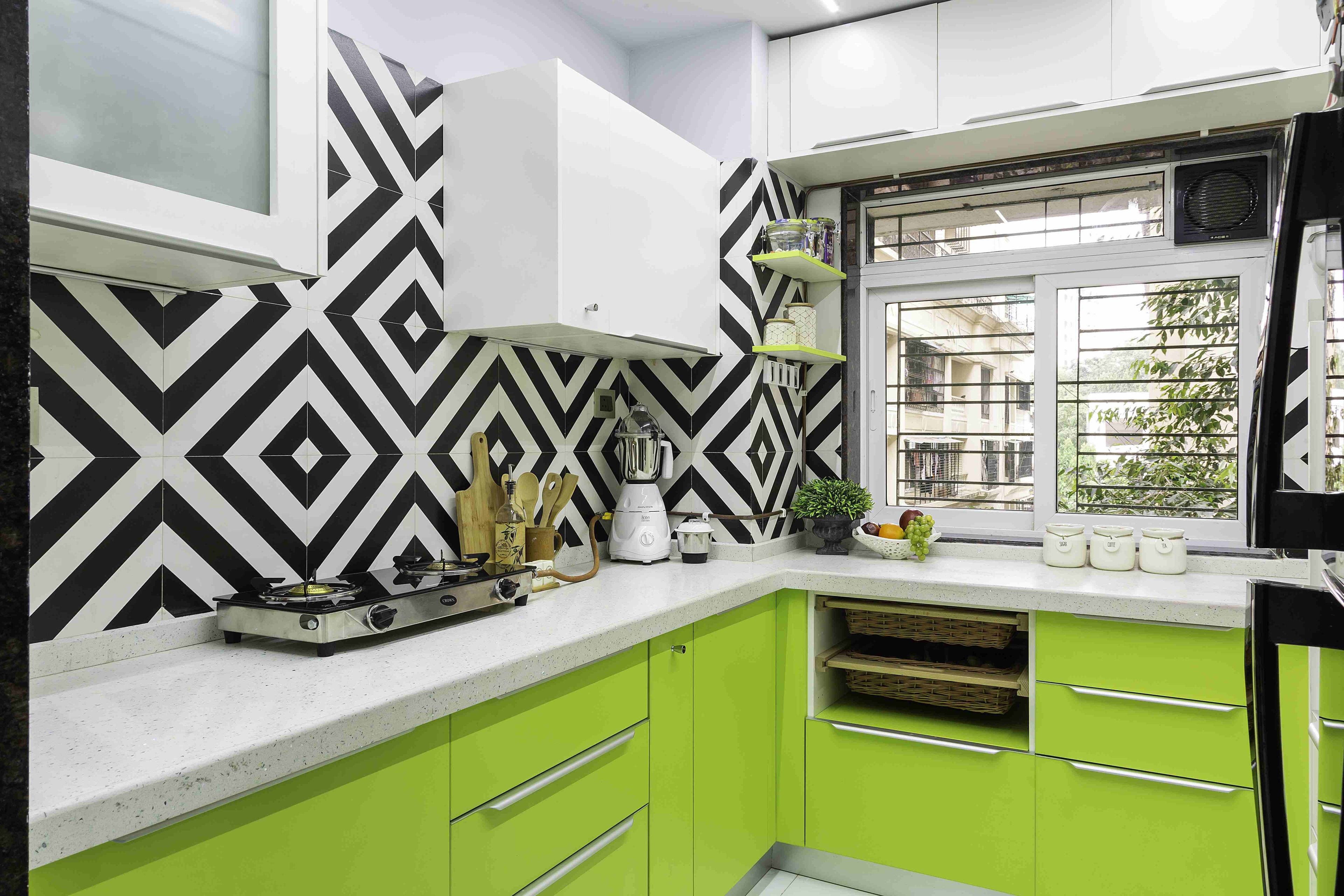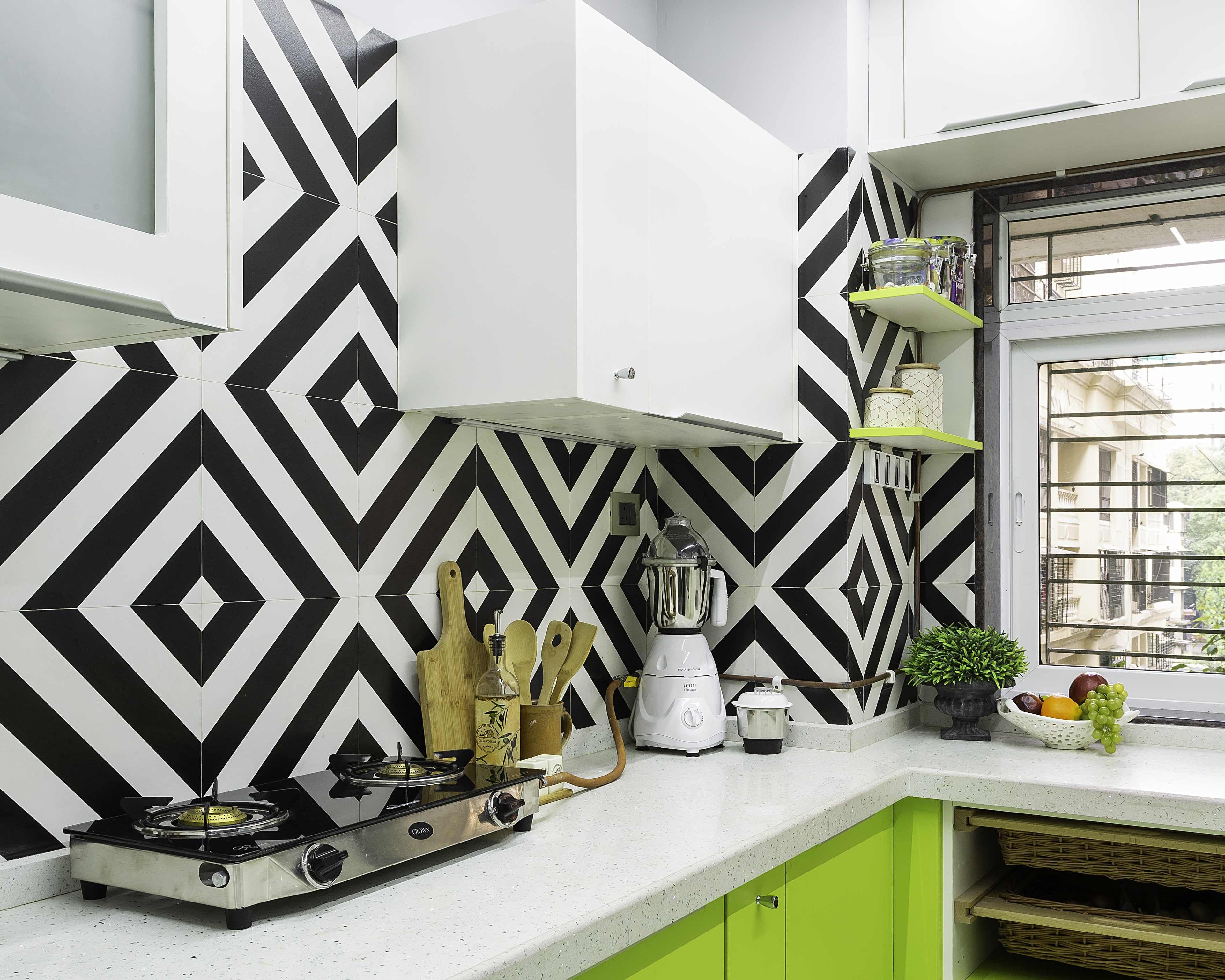 This kitchen tile design is highlighted by its use of modern Chevron-patterned wall tiles. The 1' x 1' contrasting wall tiles form a geometric pattern, which adds depth to the otherwise neutral-toned kitchen layout.