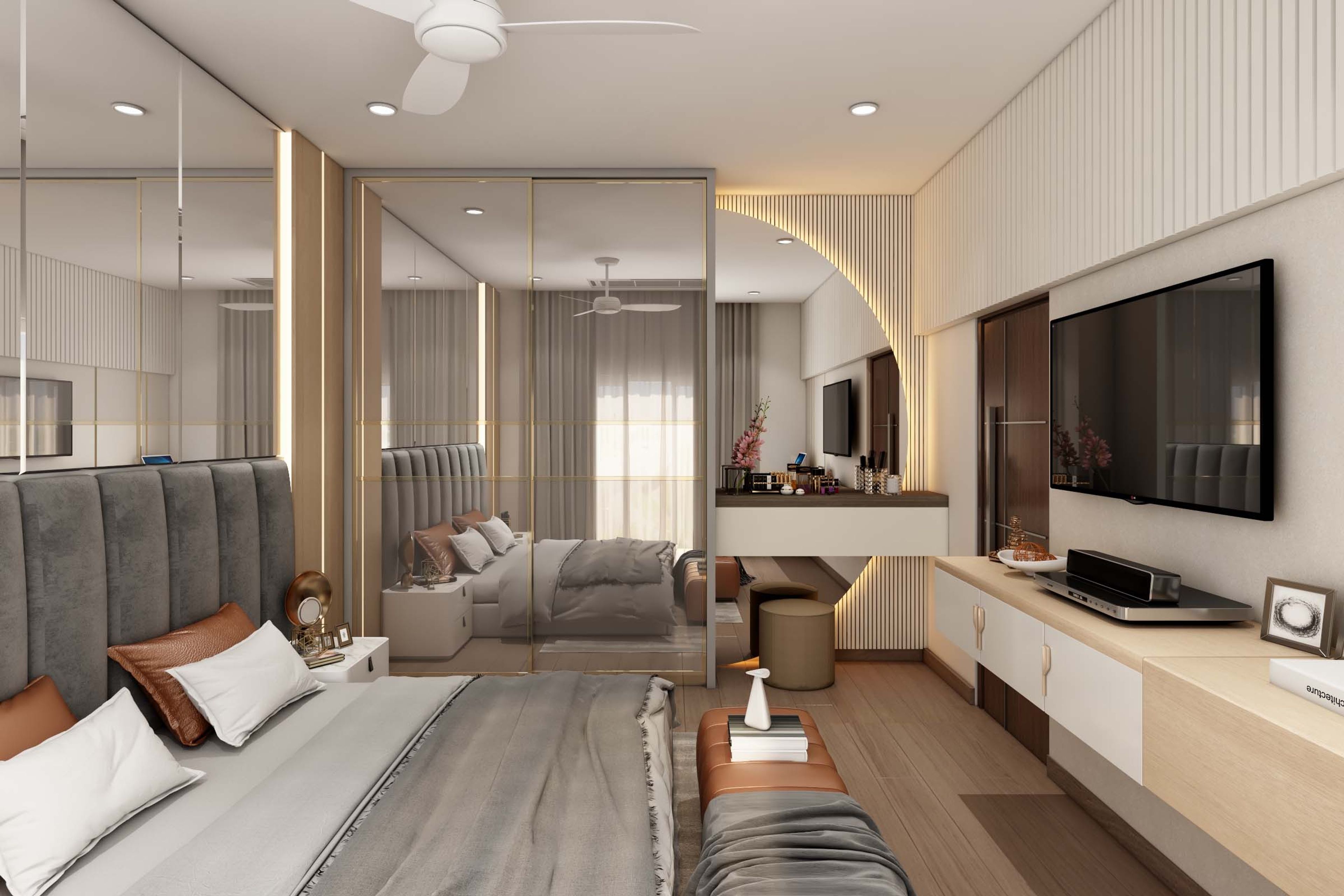 This modern bedroom tile design uses wooden flooring to ensure easy cleaning and maintenance. Plus, the wooden tiles also grant the space a sophisticated look. They merge seamlessly with the cream coloured palette of the bedroom to form a classy, urban layout.