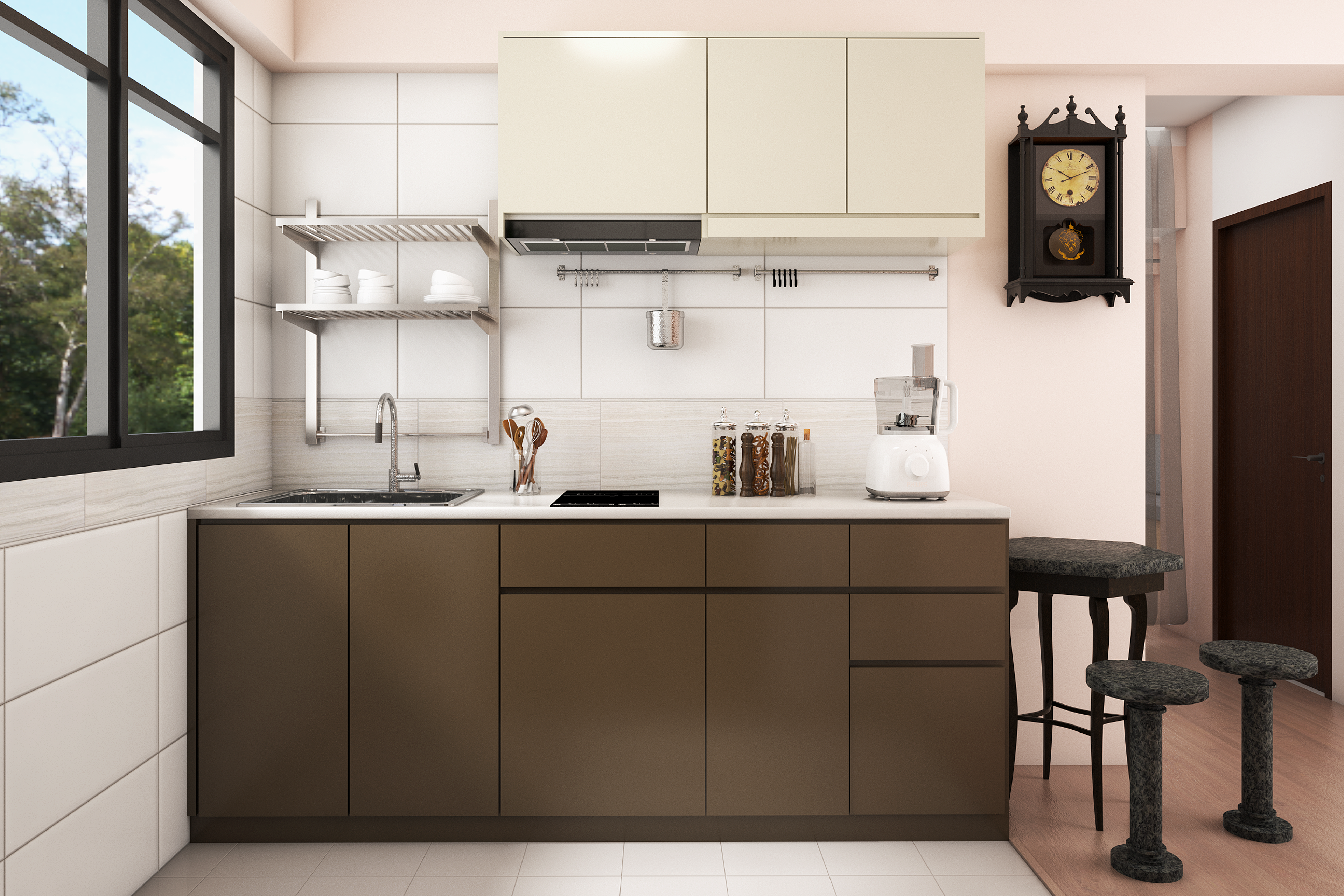 Clean and simple, this kitchen tile design is best-suited for small kitchens or kitchenettes. The light colour palette adds depth to the space and reflects the natural light pouring in, making it feel even more roomy. Plus, the combination of white walls and wooden kitchen units lend a sophisticated, modern touch to the design.