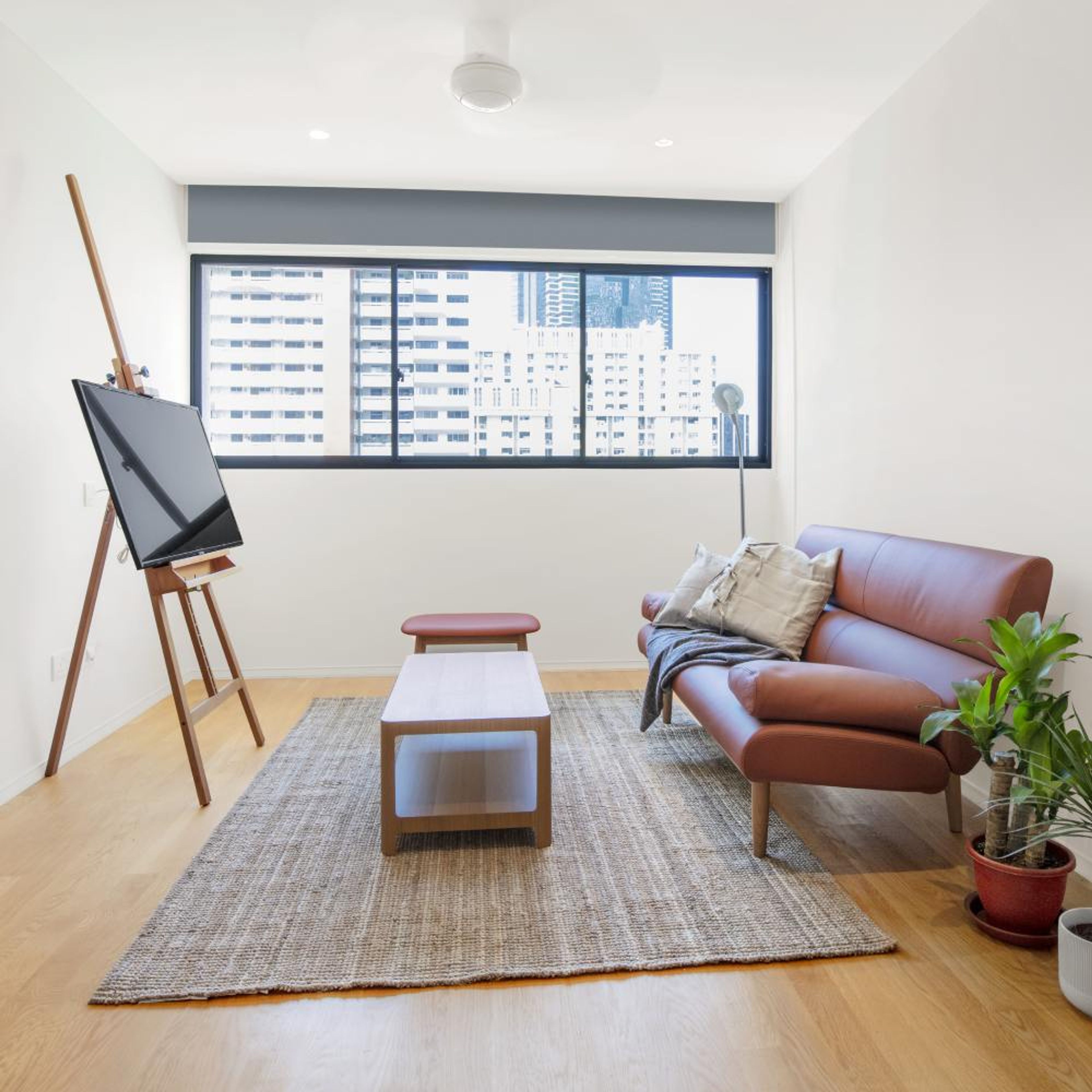 1.The unique aspect of this space is the wooden tripod stand holding the TV.