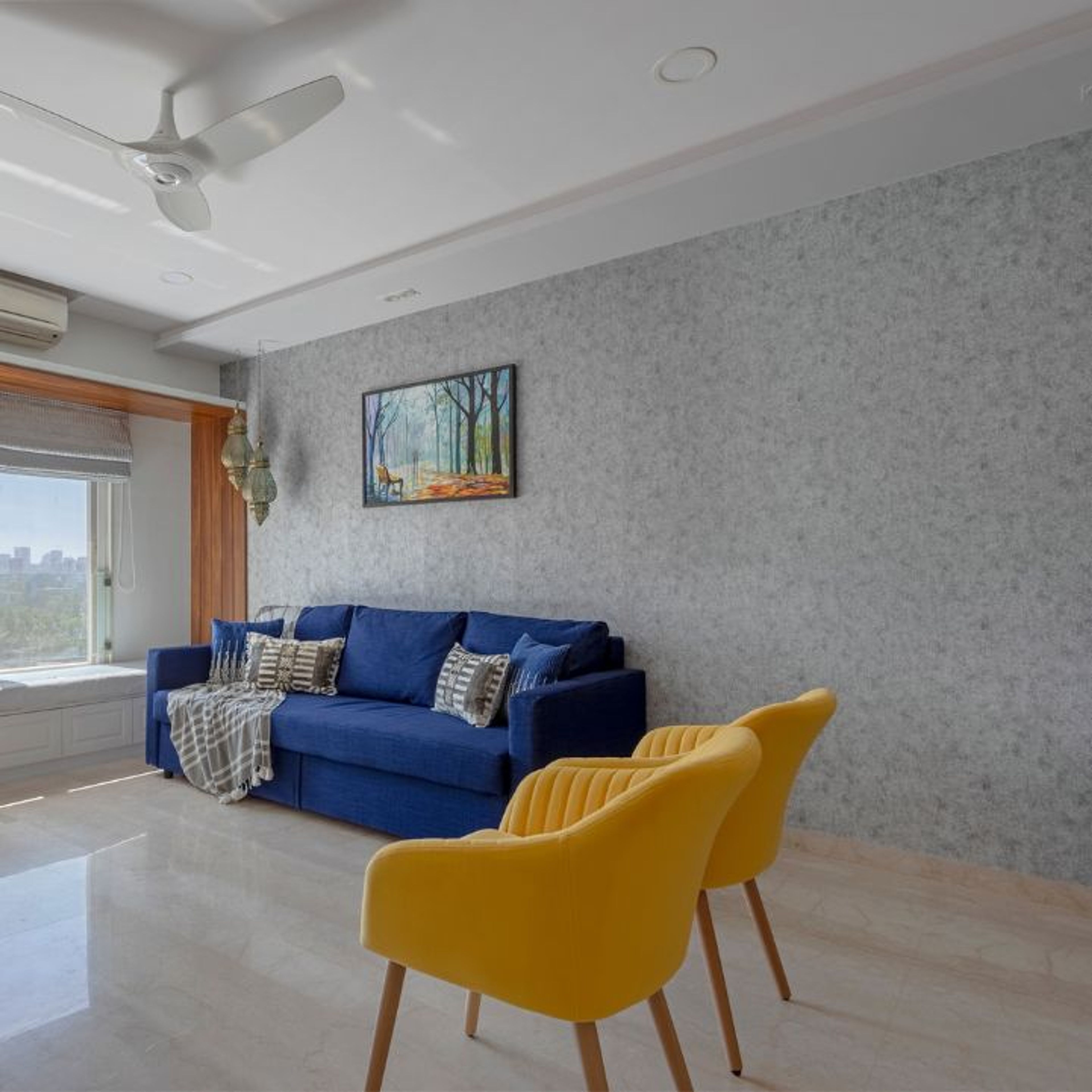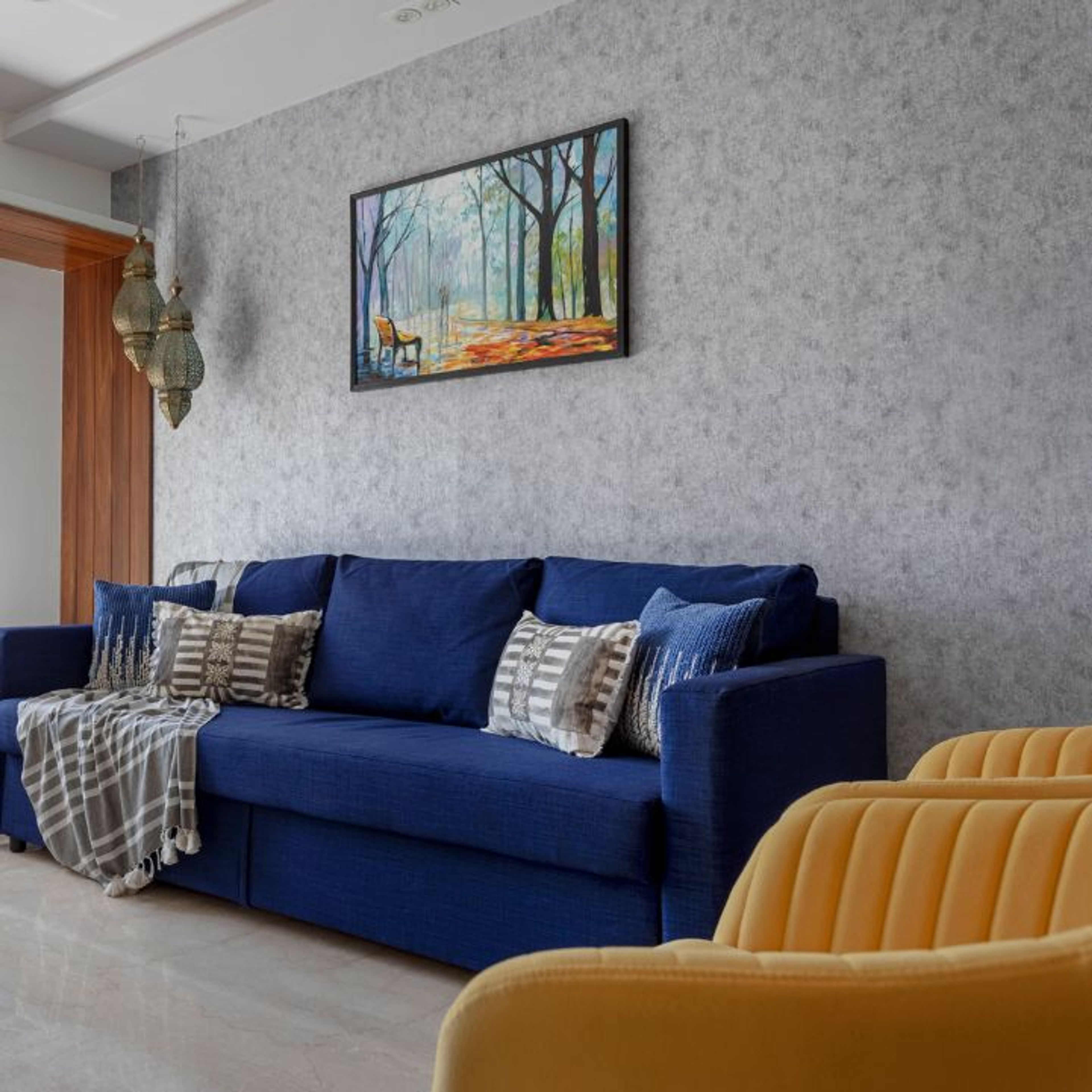 • Blue sofa and yellow accent chairs add an interesting contrast to the design