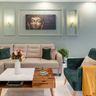• Wooden furniture combines with the colour palette to lend the space a modern look