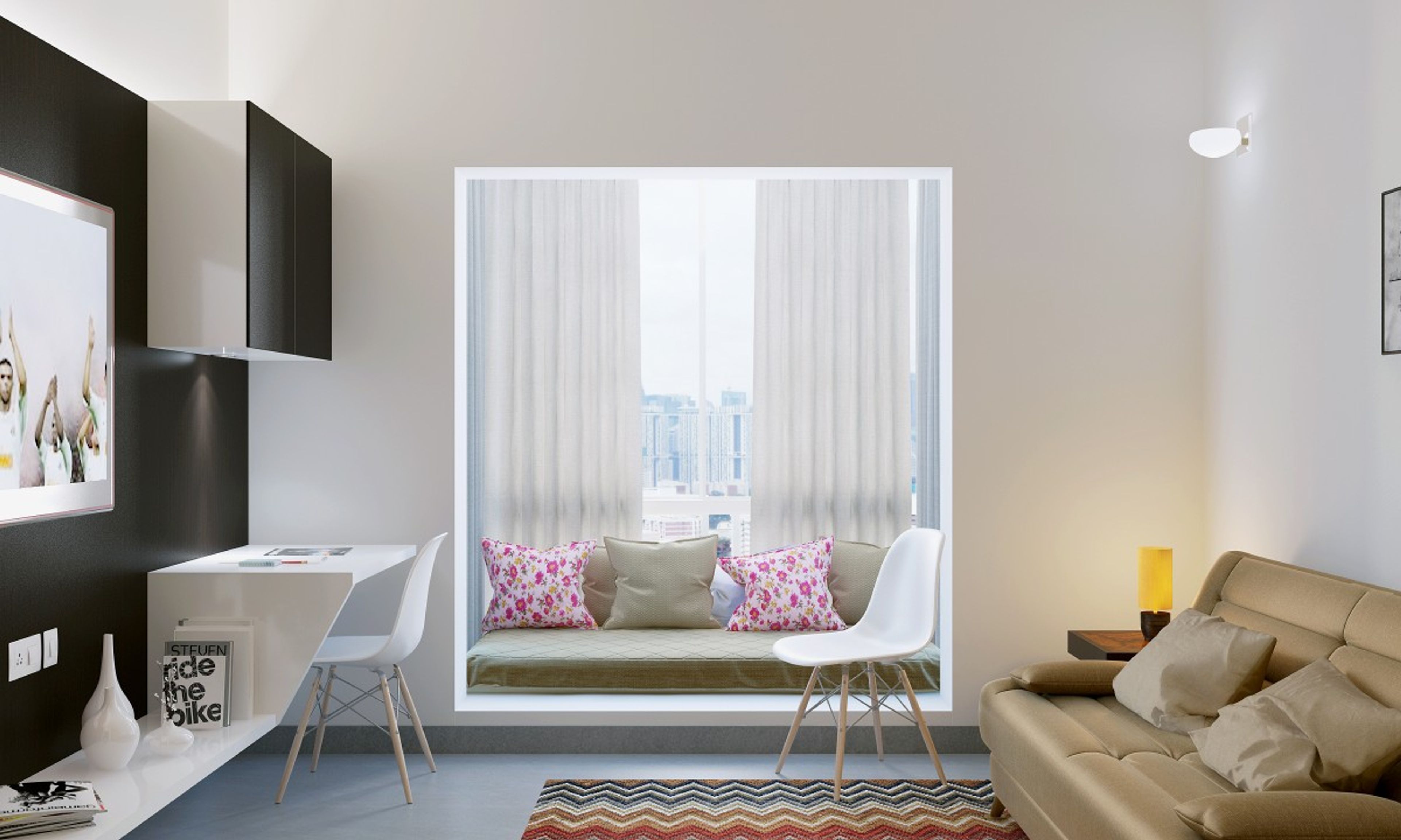 A fitting spot for unwinding, this bedroom revives the aura of a laidback vibe with its cozy ambience and tailor-made sofa cum bed. Pursuing the subtle tones, the pair of Hugo Still chairs add a dash of minimalism. Exacting drama, the Walden side table contributes texture with its old-school laminate tabletop.