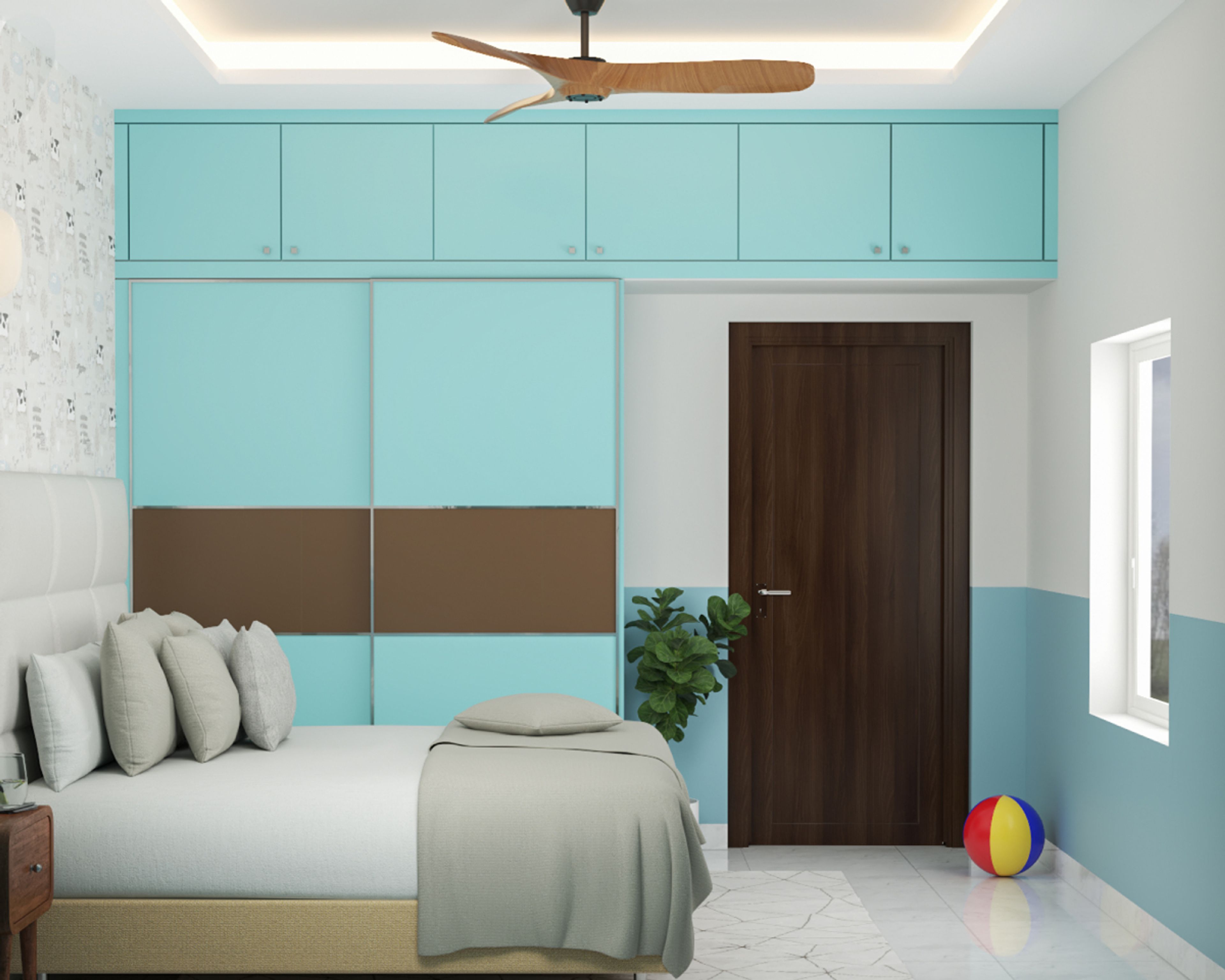 This modern boy's room design with blue and white shaded wall paint looks unique and appealing. The accent wall treated with grey monochrome wallpaper lends a calm vibe to the space. The sliding wardrobe with blue shutters looks stunning and ideal for compact spaces.
