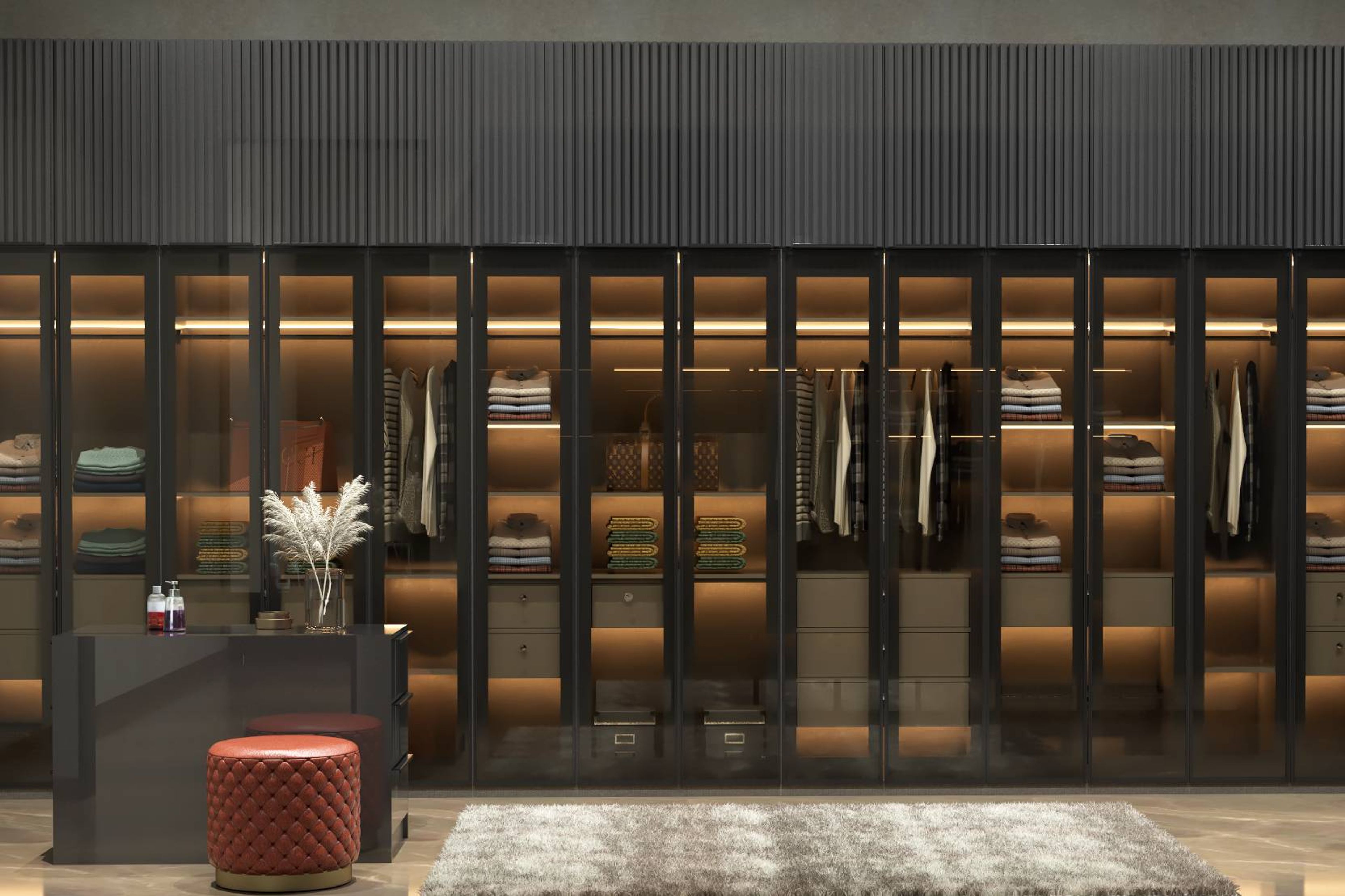 • Design Benefits: Walk-in wardrobe with strip lighting fixed on each shelf enhances the look