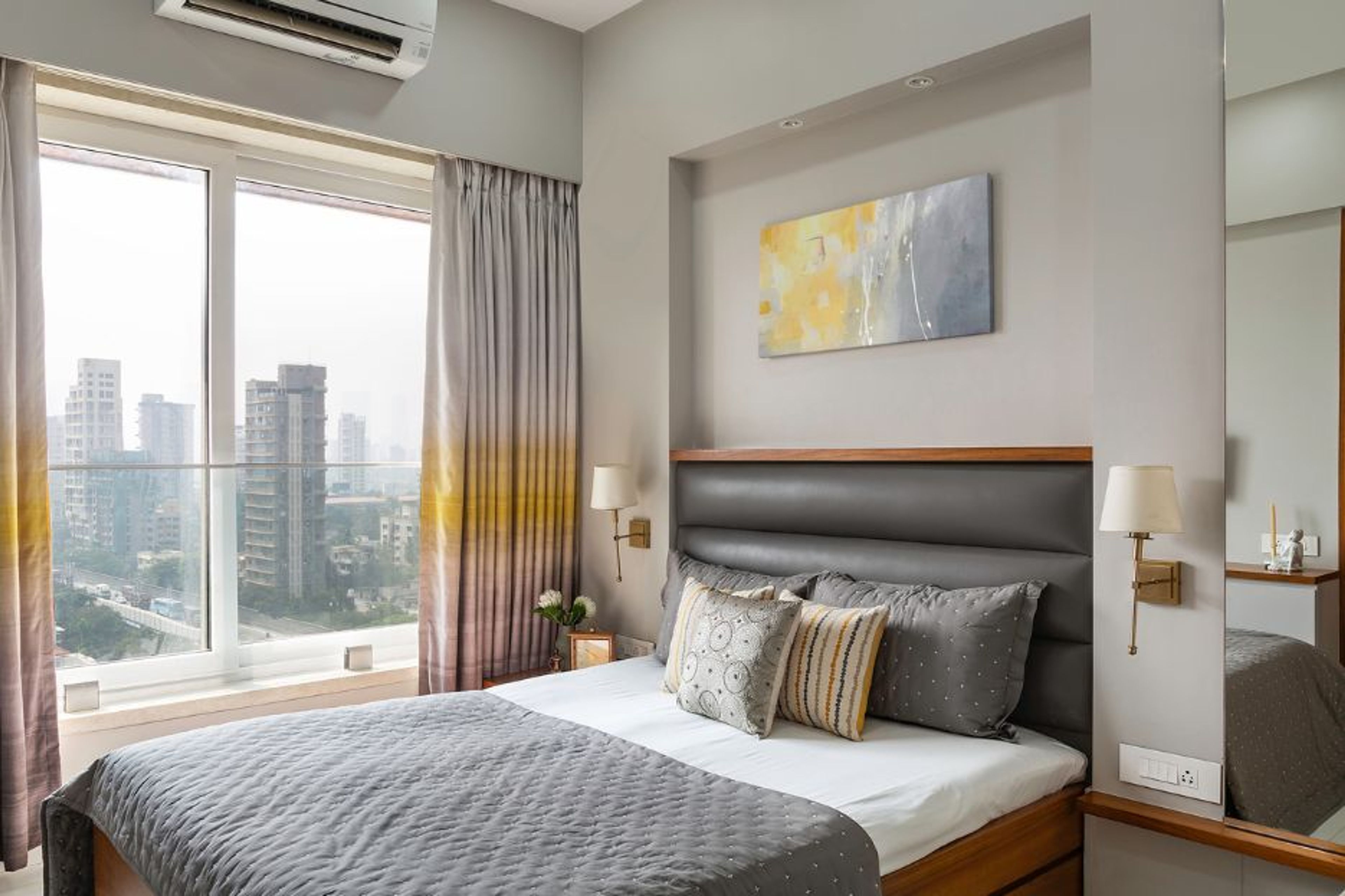 Modern Bedroom Window Design With Grey And Yellow Curtains