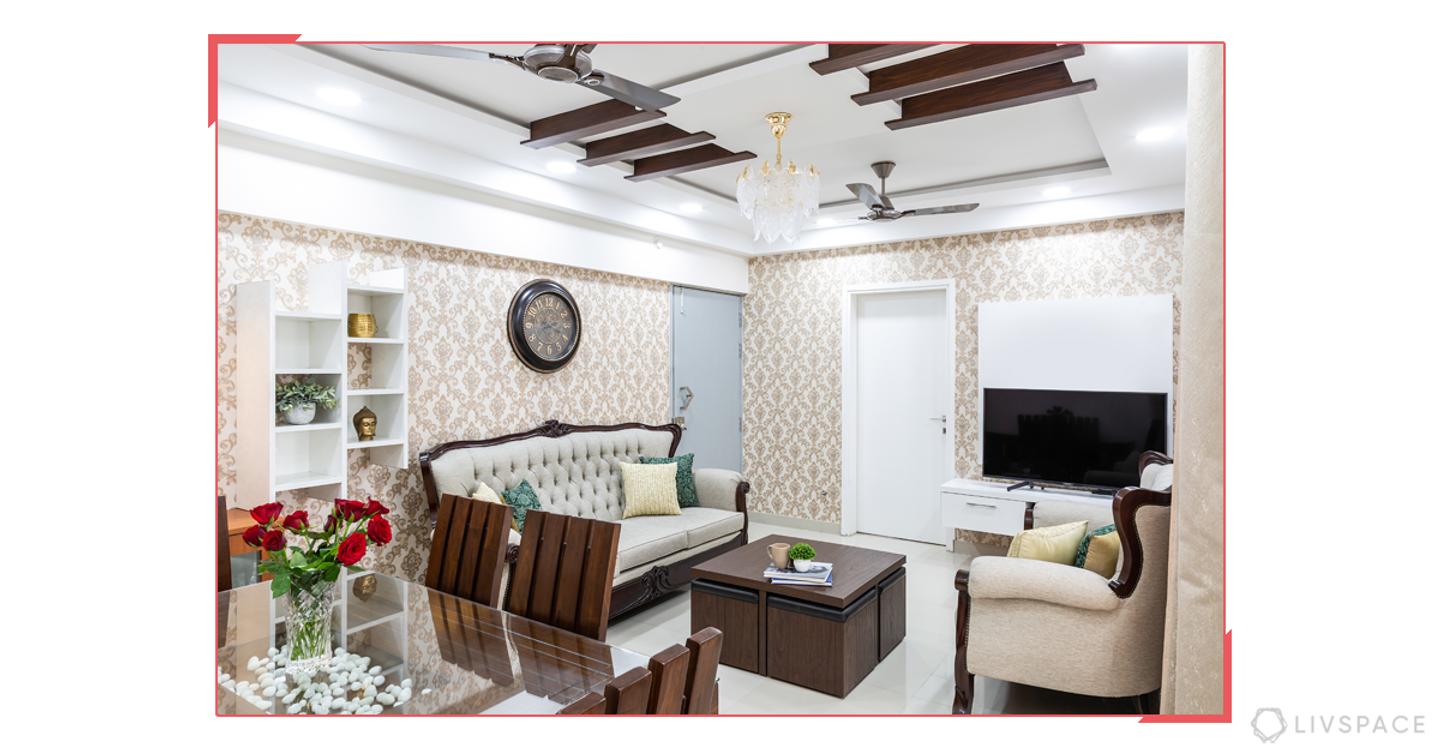 Shreeja and Rajan have South Indian origins and hence, wanted to retain a little bit of their native while designing their new 3 BHK in Pune. While the rest of the home is fairly modern, the living area has distinctly ethnic overtones. The solid wood sofa with carving and a wooden table to match hark back to typical Southern homes. To match it, Apoorva has provided wooden details in the ceiling. The wallpaper in this area too has traditional Indian motifs.