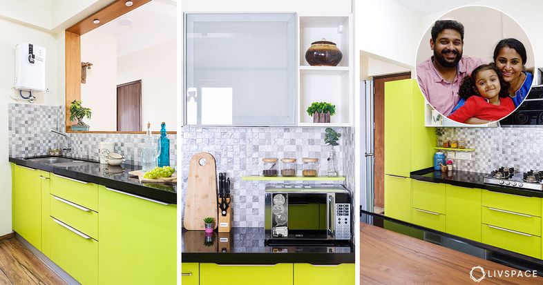 The trio sat through many meetings to finalise the colour and design for the kitchen. As Bhavya was intent on communicating with her family while cooking, a pass-through window made its way into the plan. A citrusy lime green shade was finalised to match their south Indian taste, while lots of storage space was added to the design.