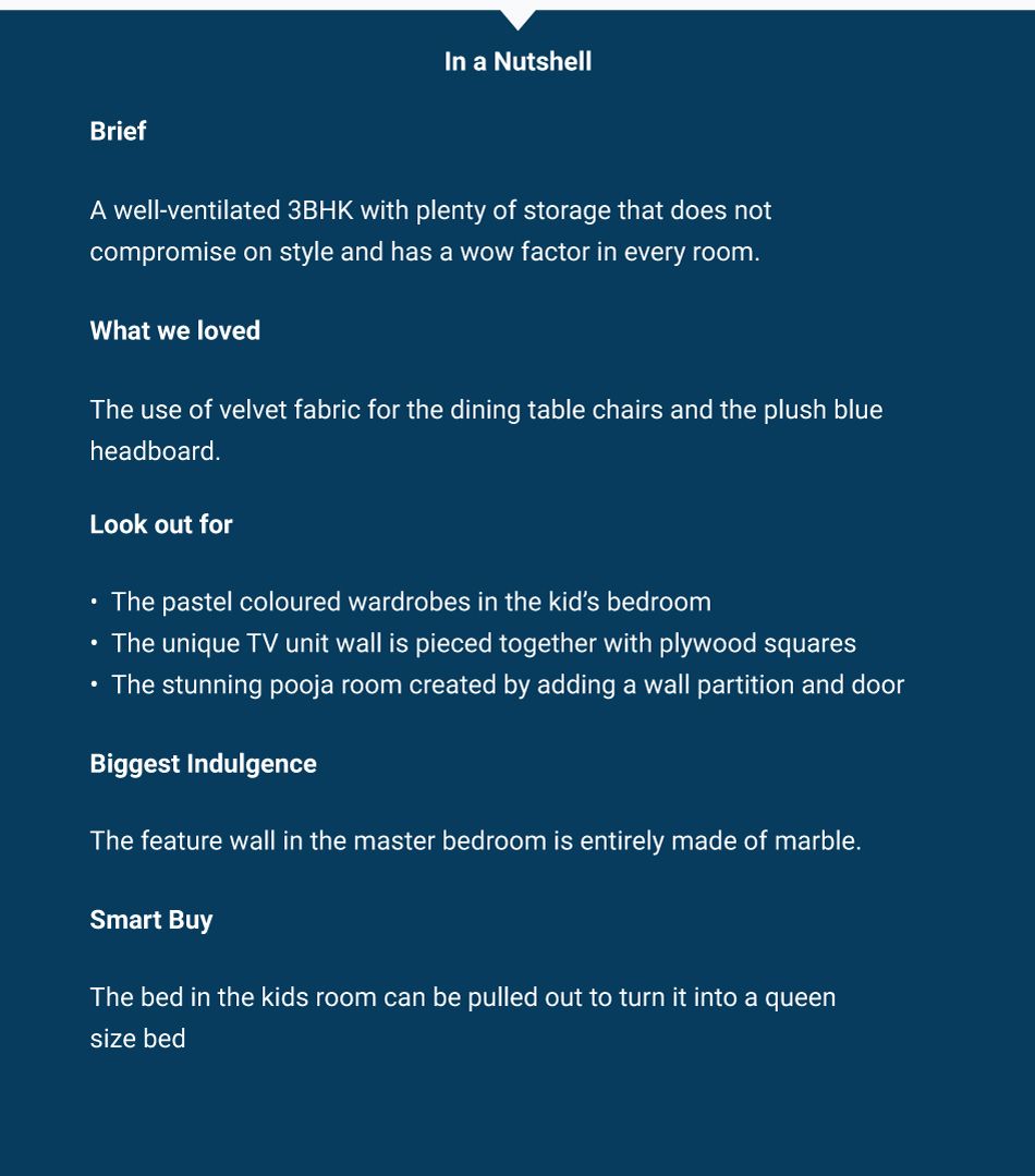 Since Apurva and his wife had contrasting ideas for their bedroom, Pooja found a way to blend the two together. The end result, a room that looks like a page out of a chic design magazine. However, the room is more than its marble and wood design, it has sleek white wardrobes and a toasty TV unit in laminate finish.