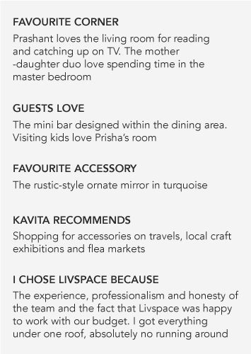 ” It was wonderful working with the Sachdevas. Kavita’s taste and involvement helped shape up the home’s theme. However, the beams and columns of the apartment were a challenge to tackle, as they appeared in tricky places in the rooms, affecting focal wall choices, wardrobes and more.”