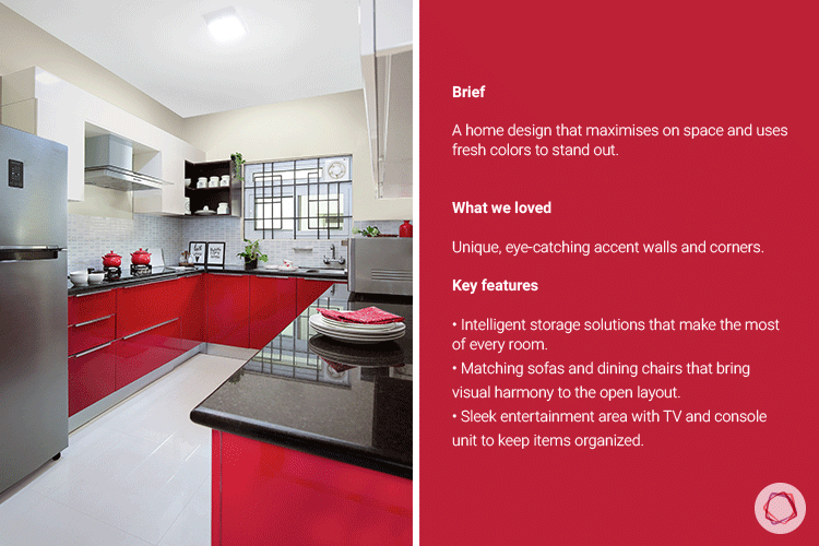 A swathe of appetizing red on the lower cabinets gives this kitchen an energetic look. Space being a constraint, Garima gave the couple an extra worktop with Blum drawers below for utensils and other items.